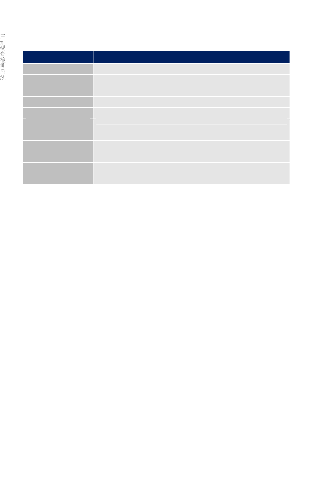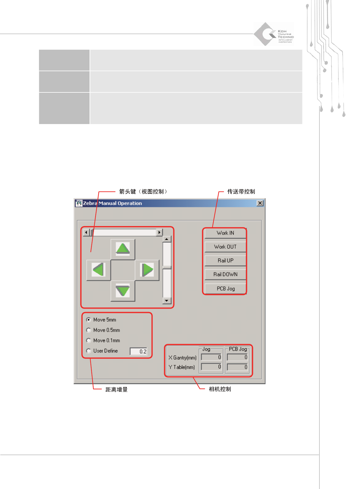 120 | 第 4 章 3D Inspector TM 版本 1.2 K OH Y OUNG T ECHNOLOGY I NC . 项目 说明 箭头键 移动 X 机架和 Y 台面。 “ Distance Increment ” (距离增量) 指定距离增量。 [5 、 0.5 、 0. 1 或用户定义的值 (mm)] “ Wo r k In ”(引入) 移入工作传送带。 “ Wo r k Out ”(移…