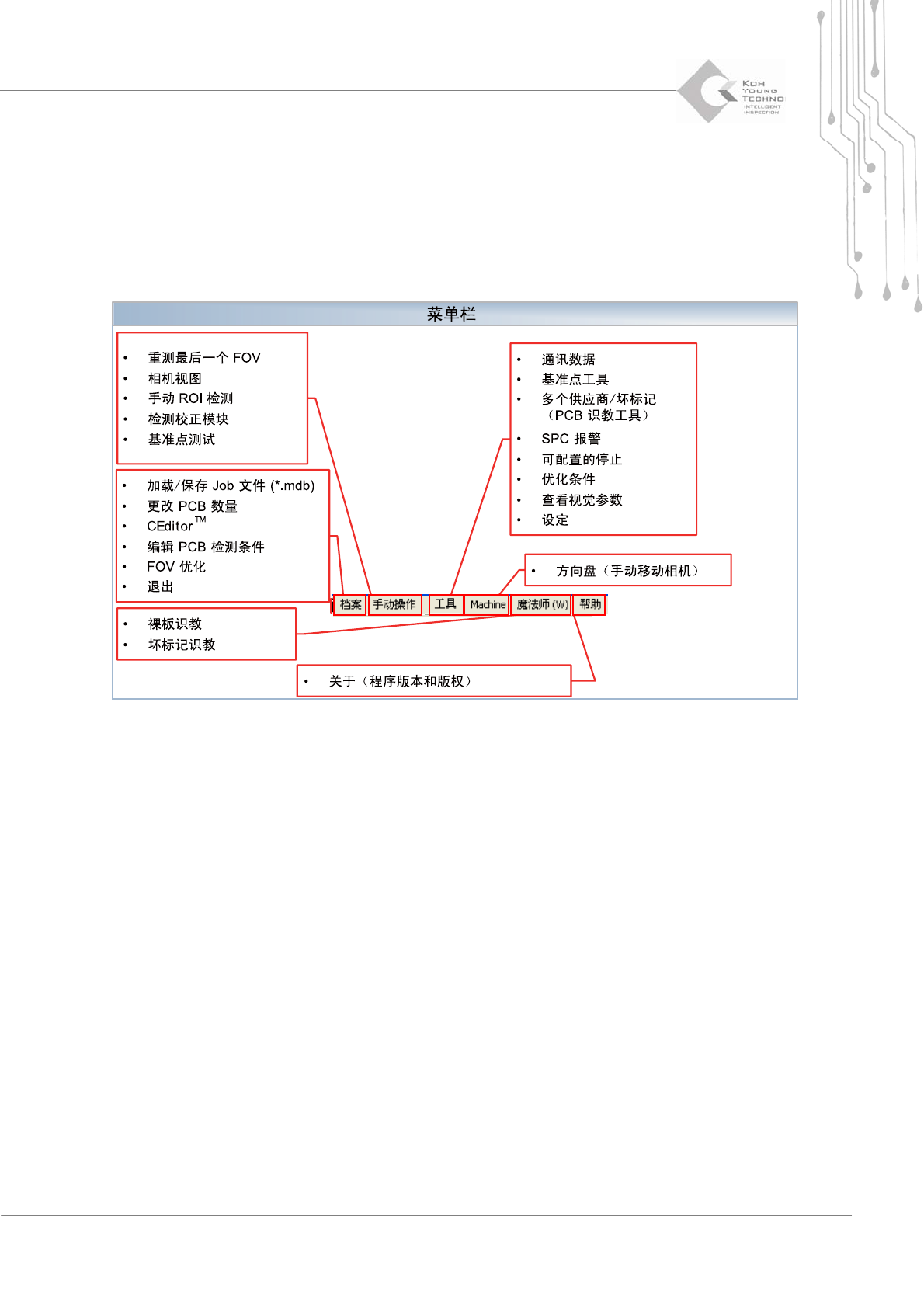 程序员手册 | 13 2.1. 菜单栏 3D Inspector™ 中的菜单栏列出了 3D Inspector™ 提供的所有功能。菜单栏位于 3D Inspector™ 的顶端。 3D Inspector™ 中的菜单栏分为以下六 (6) 个子 类。 ¾ “ File ”(档案) ¾ “ Manual Te s t ”(手动操作) ¾ “ T ools ”(工具) ¾…
