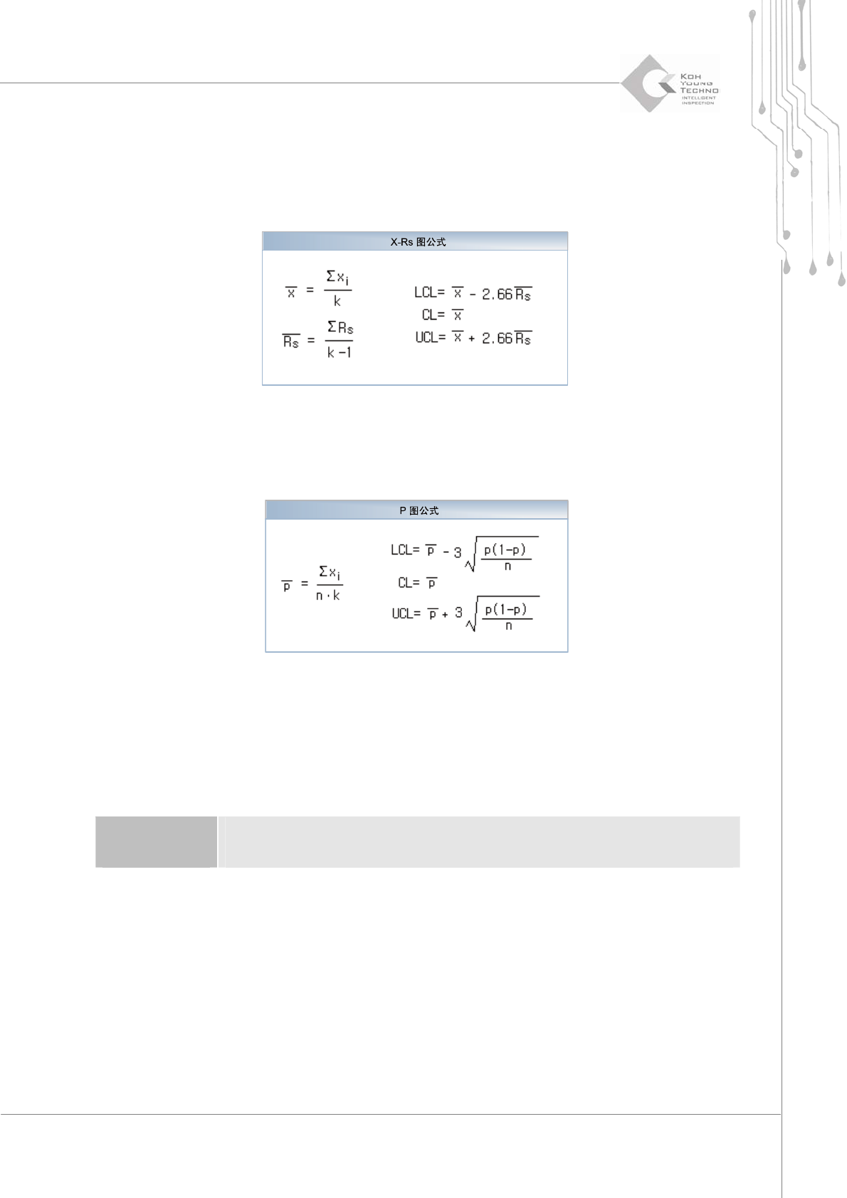 程序员手册 | 135 5. 3D I NSPECTOR ™ 词汇表 X ‐ Rs 图(与 SPI 报警 有关) 说明: LCL Æ 控制下限, UCL Æ 控制上限 P 图(与 SPI 报警有关) . 说明: LCL Æ 控制下限, UCL Æ 控制上限 坏标记检测方法 先识教没有“坏标记”的 PCB 。发现坏标记时,机器会通过比较 ROI 和坏标记…