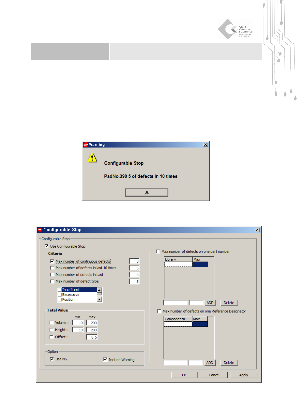 18 | 第 4 章 3D Inspector TM 版本 1.2 K OH Y OUNG T ECHNOLOGY I NC . “ Use Configurable S top ”(使用可配置的停止) 设置是否使用“可配置的停止”。 “ Criteria ”(标准) 项 说 明 “ Max number of continuous defects ” (最大连续缺陷数) 当同一 Pa d 上连续出现的缺陷数大于或等于设置的数 …
