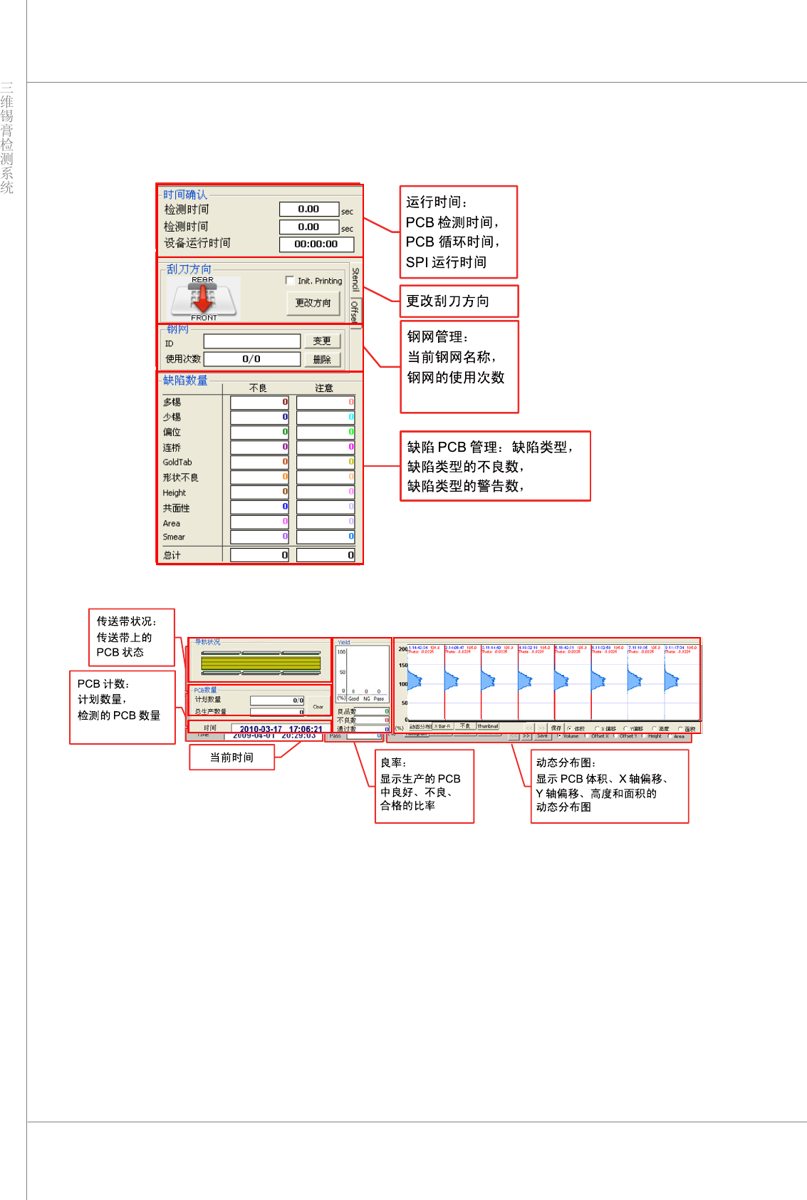 检测状态显示位于 3DInspector™ 的右侧和下方。详细说明如下所示。