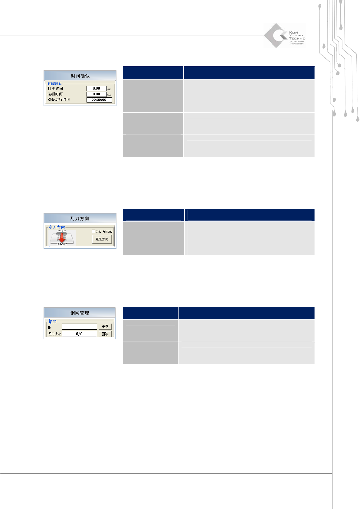 40 | 第 4 章 3D Inspector TM 版本 1.2 K OH Y OUNG T ECHNOLOGY I NC . 2.7. 检测状态显示 检测状态显示位于 3D Inspector™ 的右侧和下方。详 细说明如下所示。