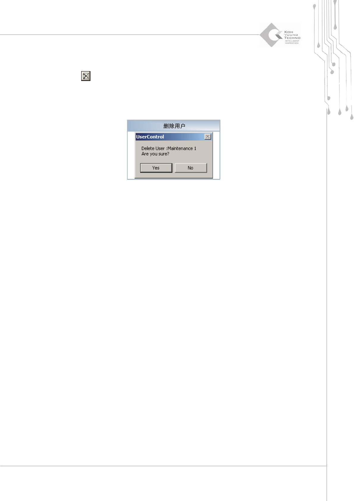 程序员手册 | 51 3.1.3.3. 删除用户 若要删除用户,请以“ Superviso r ”(主管)身 份登录,在“用户选择对话框”中选择要删除的用 户,然后单击 图标。 将会激活“ UserControl ”(用户控制)对话框。 单击“ UserControl ”(用户控制)对话 框中的“ Ye s ”(是)按钮,删除选择的用户。