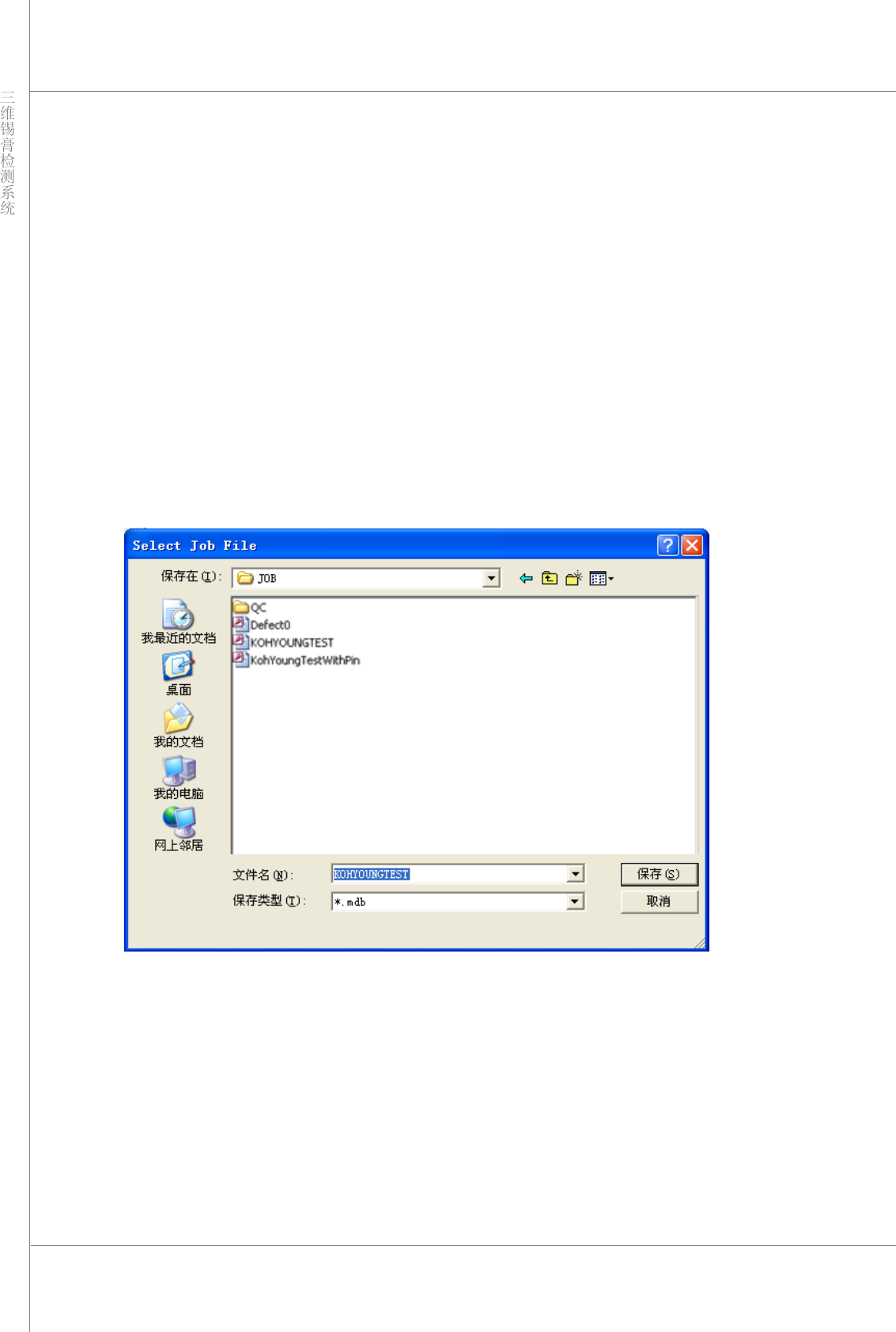 程序员手册 | 81 4.1.2. “ S AV E J OB F ILE ”(保存 J OB 文件) (A LT +F+A) 图 4 ‐ 2. “Save” (保存)对话框 我们可将 Job 文件 (*. mdb) 保存在 3D Inspector™ 中。因此,在修改 Job 文件后,请选择 “ File ”(档案)菜单中的“ Save ”(保存)按钮来保存 Job …