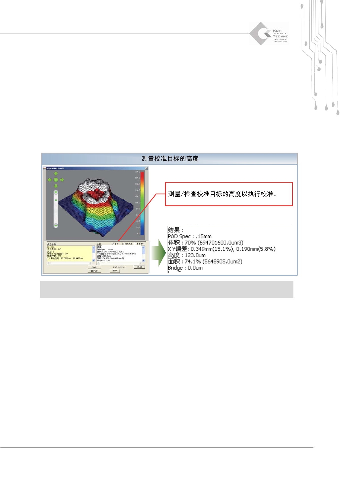 程序员手册 | 87 4.2.4. “ I NSPECTION C ALIBRA TION T ARGET ”(检测校正模块) 此功能用于补偿校准目标的高度。制 造商在交付系统前已对机器进行了精确校准。但有时因部件 更换 或故障排除等原因,需要对机器的值 进行重设,此时就必须重新校准系统。机器在启动操作后一 般不 需要校准。 此功能可测量标准样本(校准目标) 的高度。仅当校准值超出经韩国产业标准认可的标准校准目 标的 公差范…