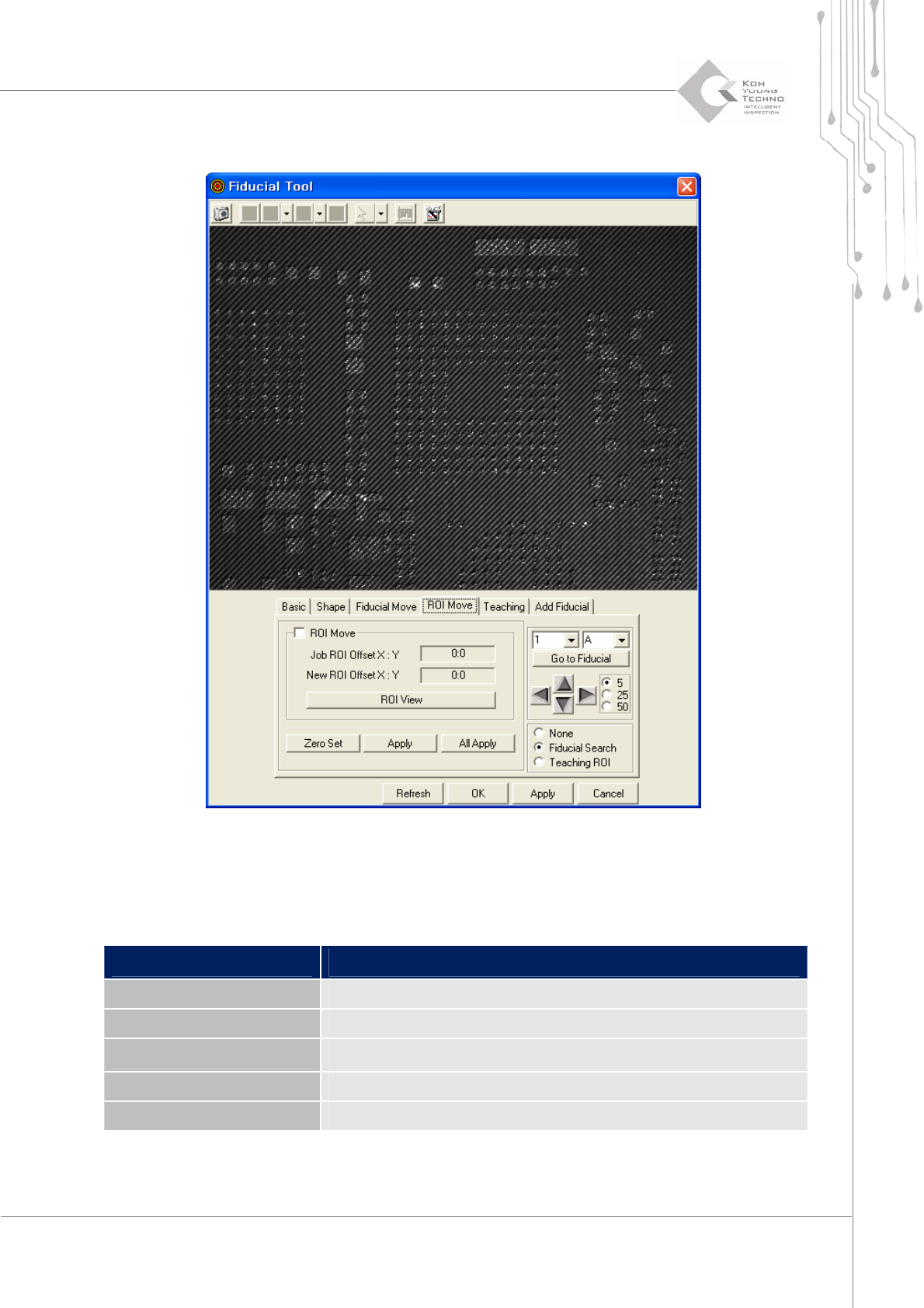 程序员手册 | 95 4.3.2.4. “ ROI Move ”( ROI 移动)对话框 图 4 ‐ 11. “ ROI Move ”( ROI 移动)对话框 重新设置基准点的 ROI (关注区域)。 项目 说明 “ ROI Vi ew ”( ROI 视图) 显示 ROI 。 “ Zero Set ”(零设置) 初始化 ROI 设置。 “ Apply ”(应用) 将更改的设置应…