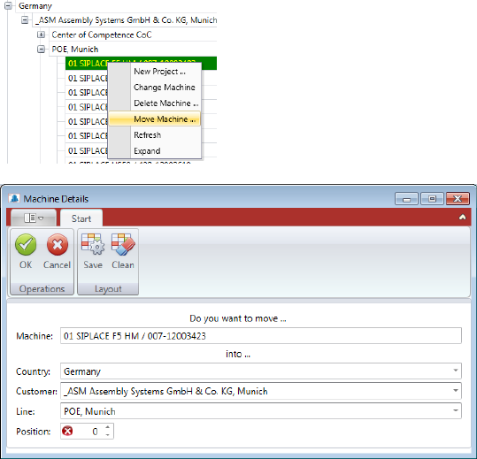 Now you can reassign "Country", "Customer", "Line" and the "Position" of the machine in the