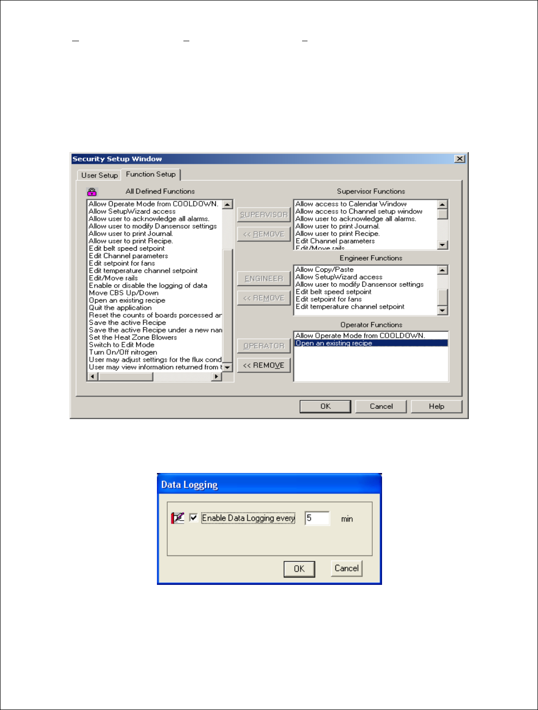 38 列表中删除用户。完成所有条目后,您可以定 义每个用户的安全级别:点击用户名,点击“ 操作员” ( O PERA TOR ) 、 “工程师” ( E NGINEER )或“管 理员” ( S UPER VISOR )按钮。用户名将出现在所选文 本框中。 可以在任何时候在安全级别数据库列表中添加、 编辑或删除用户 。 点击 “ OK ” 按钮, 保存所有 信息并返回至前一个屏幕; 或点击 “取消” ( Cancel ) 按钮, 取消所…