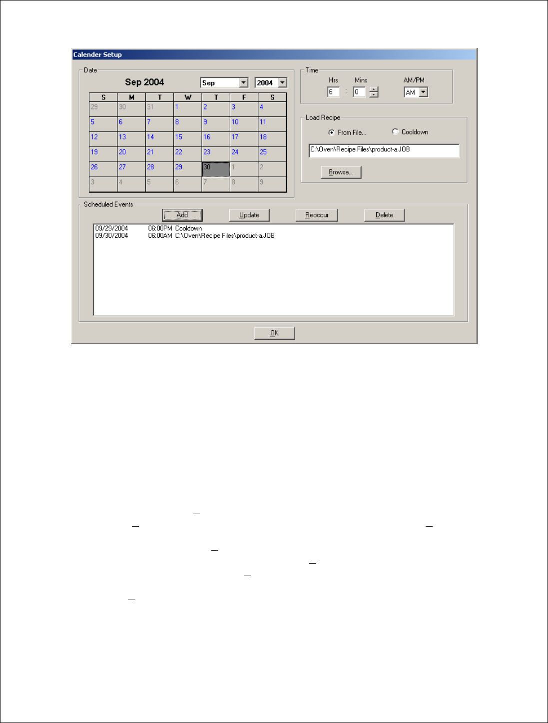36 D .预定日历事件 图 36 当用户进入日历屏幕,将显示当前年份、月份和日期。该屏幕由五个需要设置的数据区组成。 1. 设定配方运行的日期: 点击月份 下拉箭头, 然后点击所需月份。 点击年份下拉箭头, 然后点击所 需年份。最后在日历上点击所需日期。如果只修改日期,则不必输入月份和年份。 2. 设定您希望配方运行的时间。 点击小时文本框, 输入小时数值或点击向上、 向 下箭头至所需小时 数值。 然后点击分钟 文本框, 输入分钟数值…