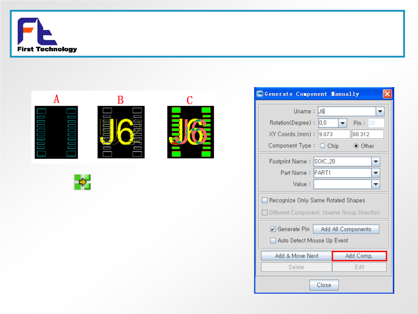 7. 定义每个零件的脚位 定义每个零件的脚位 定义每个零件的脚位 定义每个零件的脚位 ( ( ( (手动添加 手动添加 手动添加 手动添加) ) ) )和 和 和 和 ( ( ( (自动添加 自动添加 自动添加 自动添加 2 pin ) ) ) ) A . 选择 CA D 和对应的 Mask Pin ,点击“ Add Footprint ” ePM -Step 7 © First Technology China Ltd. Confid…