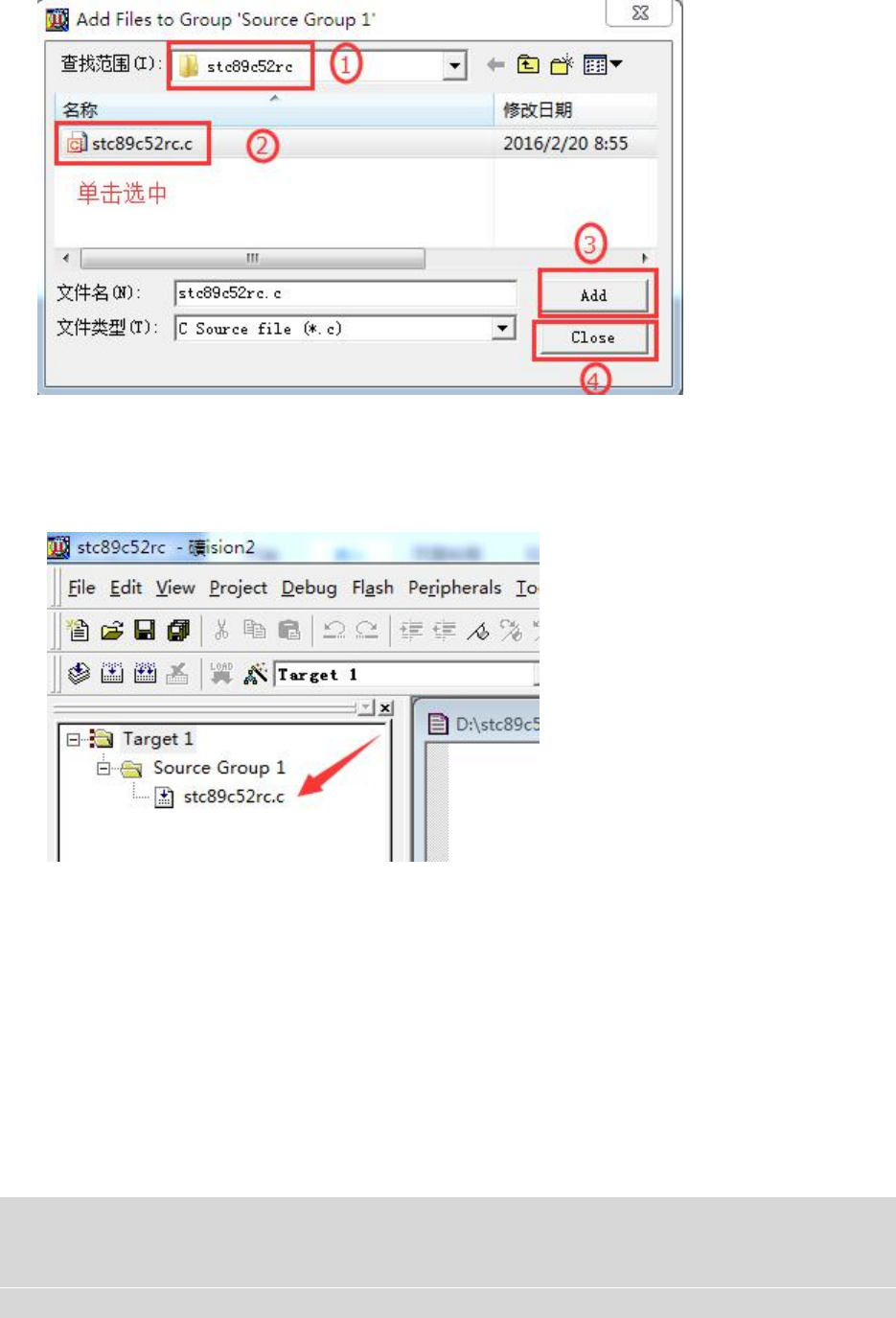 选项,弹出一个文件选择对话框,单击选中刚才新建的.c 源文件,然后单击一次“Add”按钮,此时虽然对