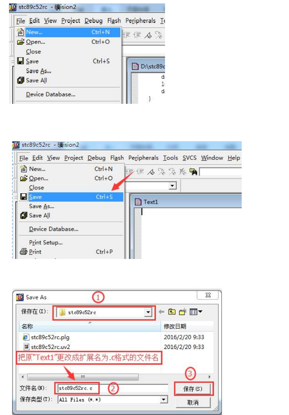 第五步:新 建一个.c 源文 件。 点击上面 ” Fi le”选项, 在弹出的下 拉菜单中选 择 “ New...” , 会看到弹出来 一个名字 为”Text1” 的文 件。 再一次 点击 上面” File” 选项 ,在弹 出的 下拉 菜单中 选择 “S ave” ,会弹出一 个保 存的 对话框 ,此 时还 是选择保存 在第一步新 建的文件夹 目录下,并且把 “Text1” 文件名 更改为“stc89c52rc.c” (注意后缀是. c…