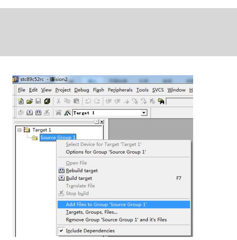1”。右键单击“Source Group 1”选项,在下拉菜单中选择“Add Files to Group ‘Source Group 1’”