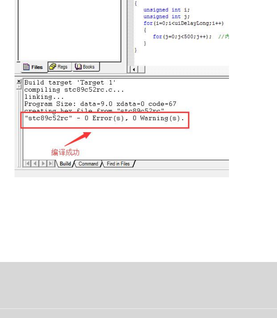 窗口最后一行显示“"stc89c52rc" - 0 Error(s), 0 Warning(s).”等信息时,表示翻译工程结束了。其中