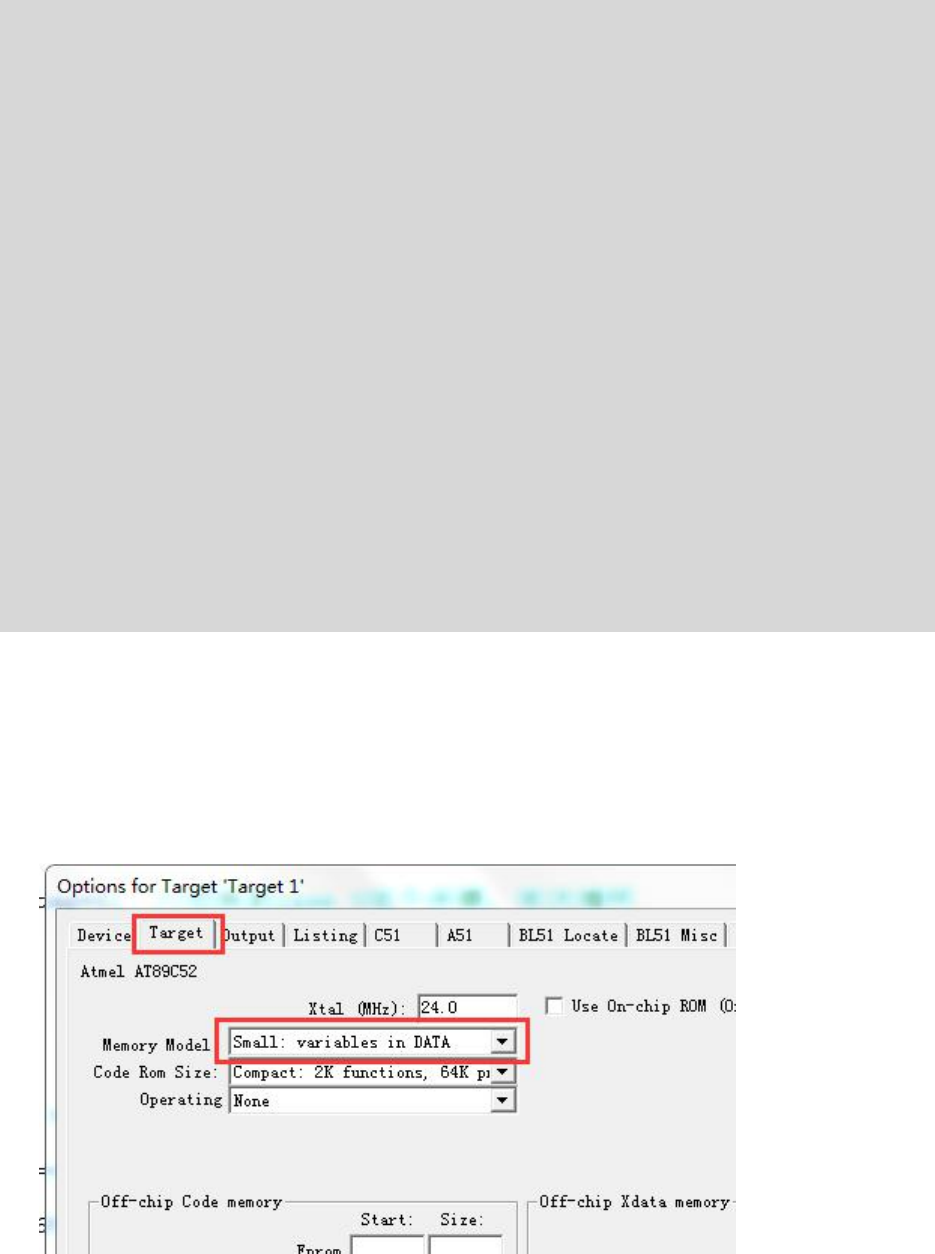 for Target 选项,弹出的窗口中,切换到 Target 选项,在 Memory Model 选项中选择 small:variables in Data。