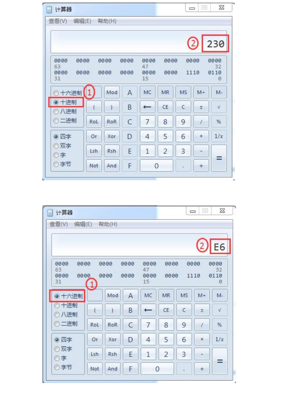 即可完成从十进制到十六进制的数据转换。比如输入十进制的“230”,切换到十六进制后就变成了“E6”。