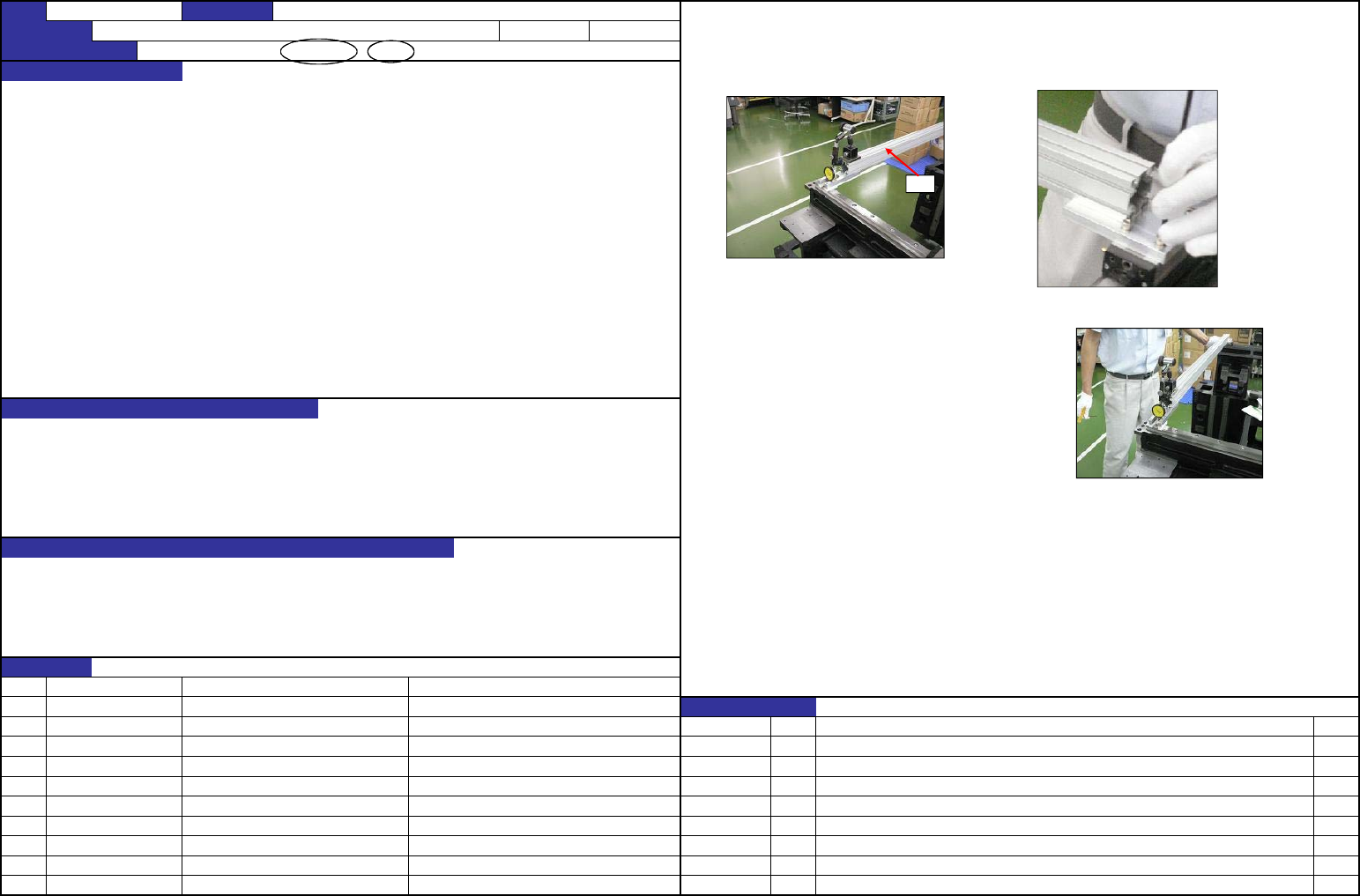 QA表 机种 确认方法 1.确认从石定盤(治具底面) 至 X_LM 导块上面切削部分的高度是否已是 208±0.05mm。 从X框架头的 Y_LM 导块安装面至 X_LM 导块上面之切削面的高度为 163mm 调整方法 1.将高度规对齐 JIG_MASTER 的上面切削部分,取 208±0.05mm的值。 贴装精度的直角偏斜 *基准位置在反侧也相同 1.贴装精度的直角偏斜 2.从LM导轨发出异音及L M导轨损坏 3.贴装精度恶化,吸附率…
