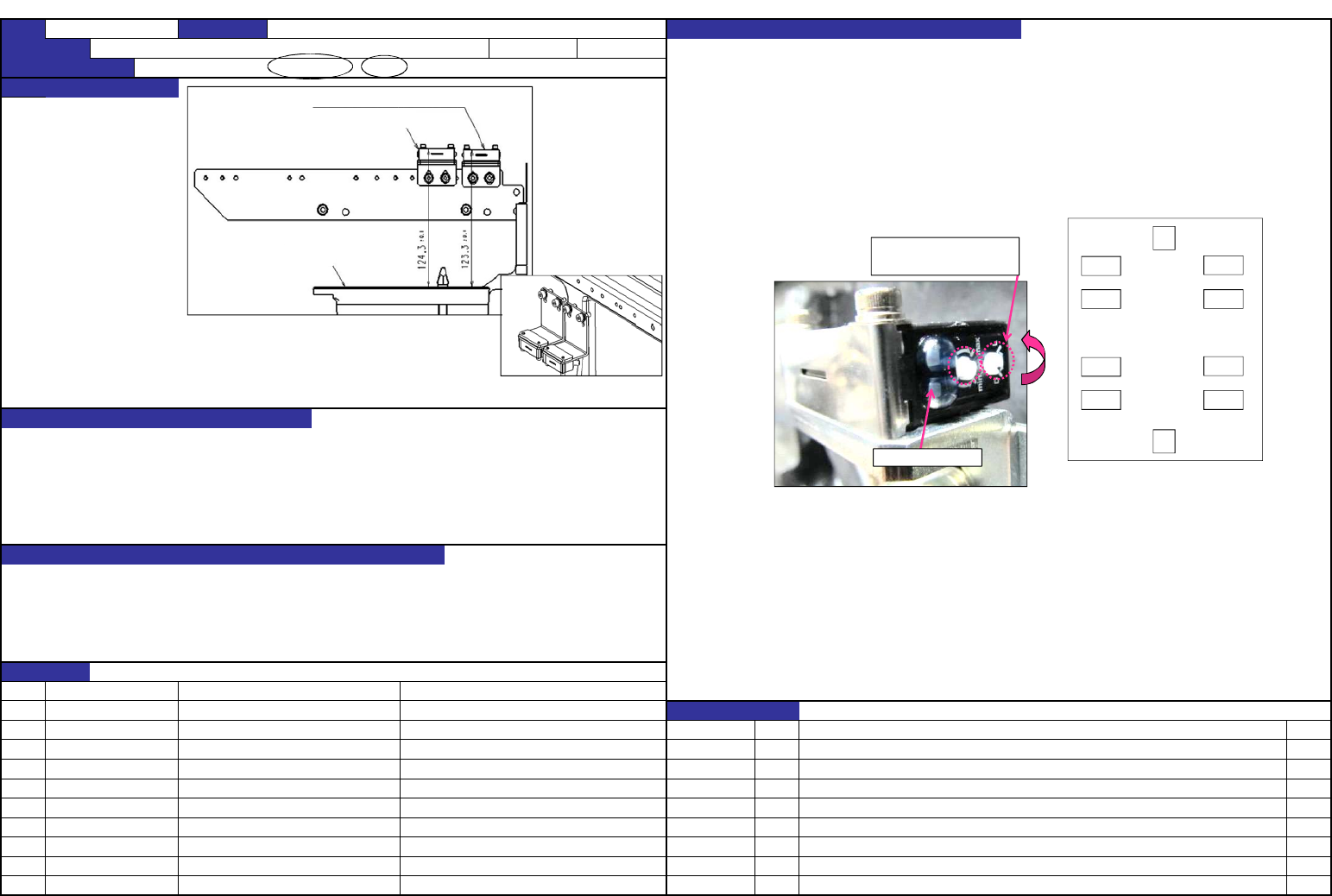 QA表 机种 ①电动台架导板上面~传感器上面尺寸(左右之差在 0.1mm以下) ・ 送料器浮起传感器 (机械台架基准: 123.3mm) 116.75±0.1mm ・ 误插入防止传感器 (机械台架基准: 125.7mm) 114.35±0.1mm ※安装如②时 ・ 送料器浮起传感器 (机械台架基准: 127.6mm) 121.05±0.1mm ・ 误插入防止传感器 (机械台架基准: 130.0mm) 118.65±0.1mm 检测送料器…