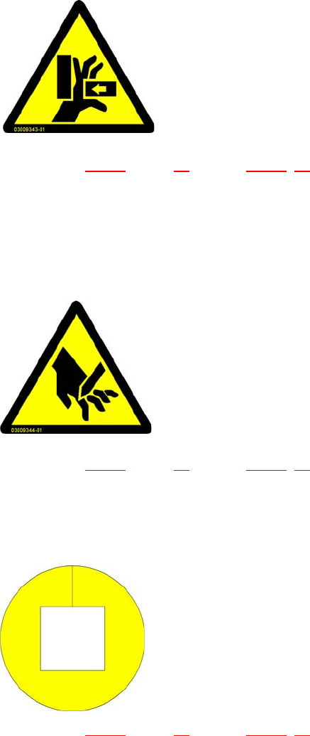 Figyelmeztető táblák a hevedervágó készüléken és a hevederhulladék-csúszdán.