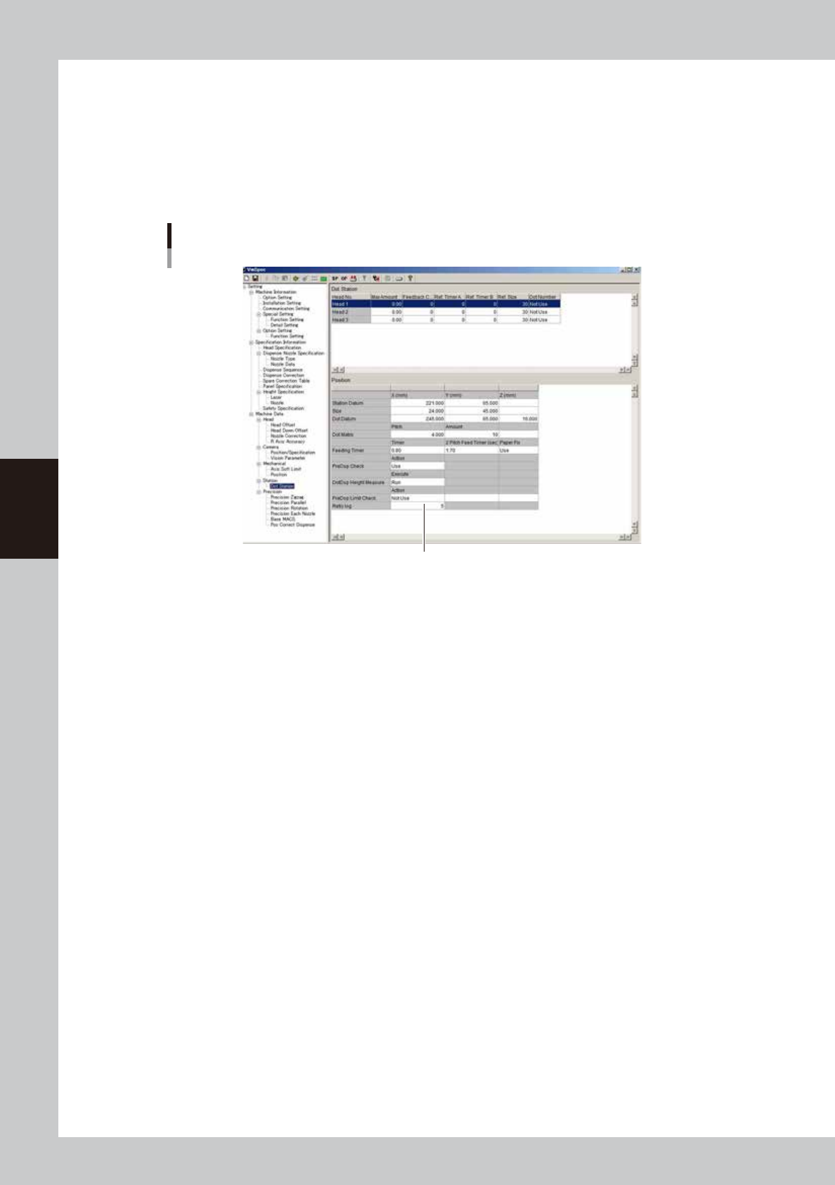 4-50 4 Making the dispensing stable 5.4.1 Setting method Make the machine data setting to use this retry function. Enter the retry count. On the [Machine] - “Machine Data” – “Dot Station / Position” screen, enter the r e…