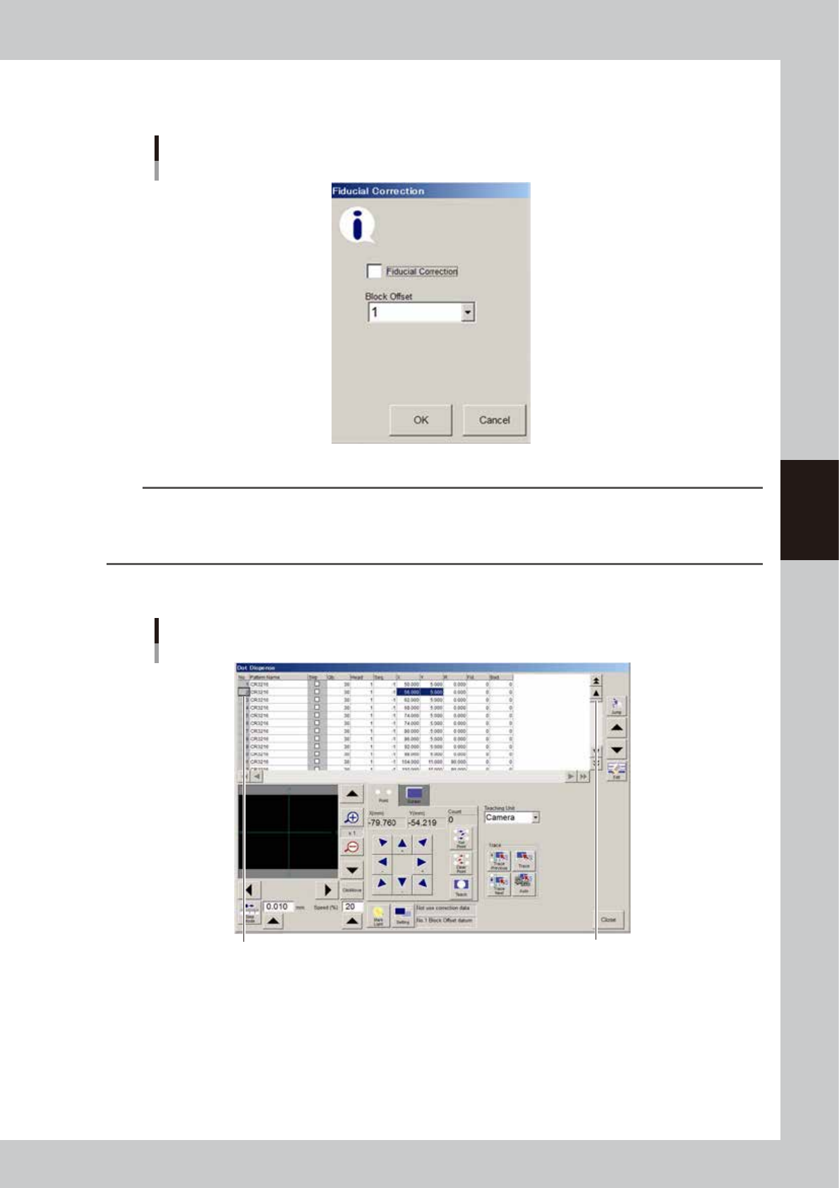 4-57 4 Making the dispensing stable 3. If the board data uses fiducial correction, select the [Fiducial Correction] check box in the dialog box. Fiducial correction setting 64455-N7-00 n Note When you correct, add or cre…