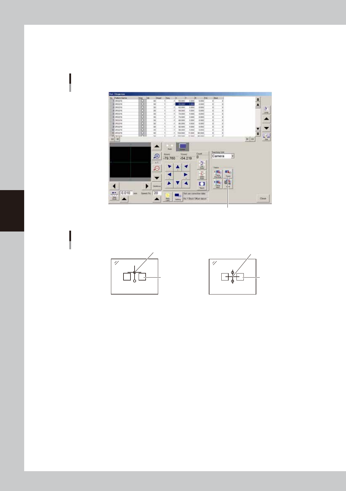 2. The camera moves to the selected dispense position. Check that the center cursor in the vision