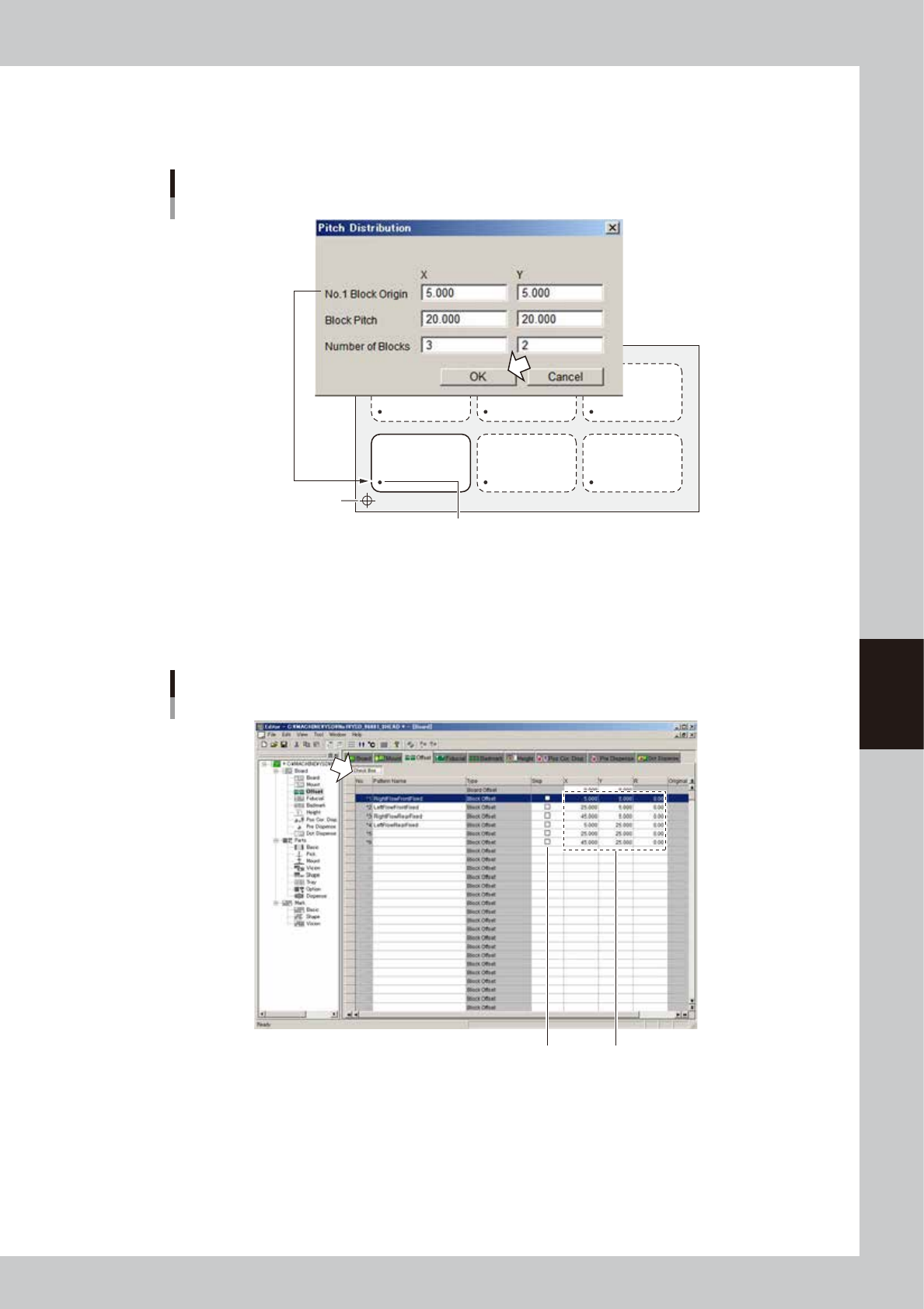 5-20 5 Creating the board data 4.3.1 Pitch distribution function T his function allows you to create block offset data at a specified pitc h by entering the block pitc h and the number of blocks. 1 Start the Editor . 1. …