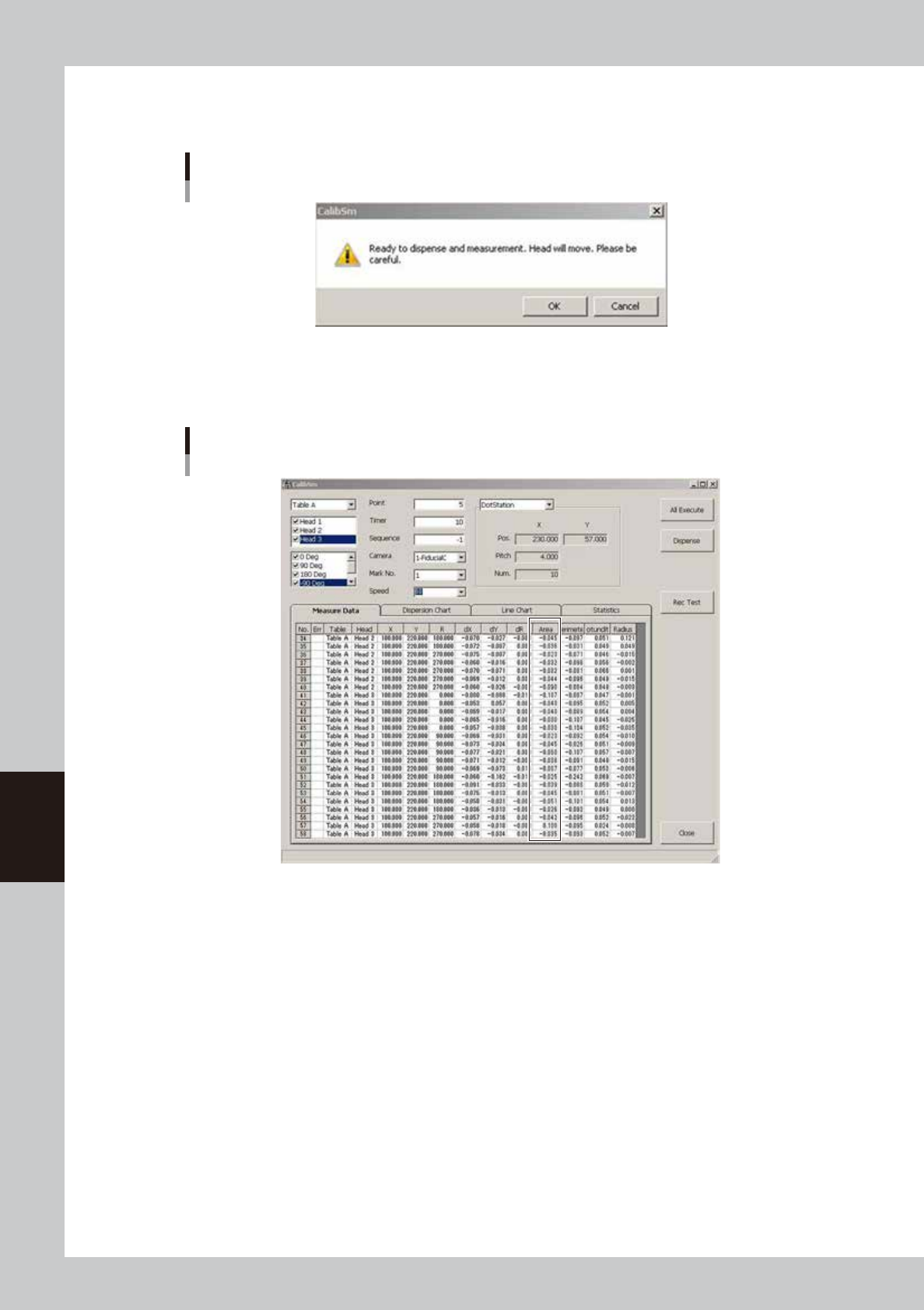 dx, dy : Shows the positional deviation of each dispensed dot.