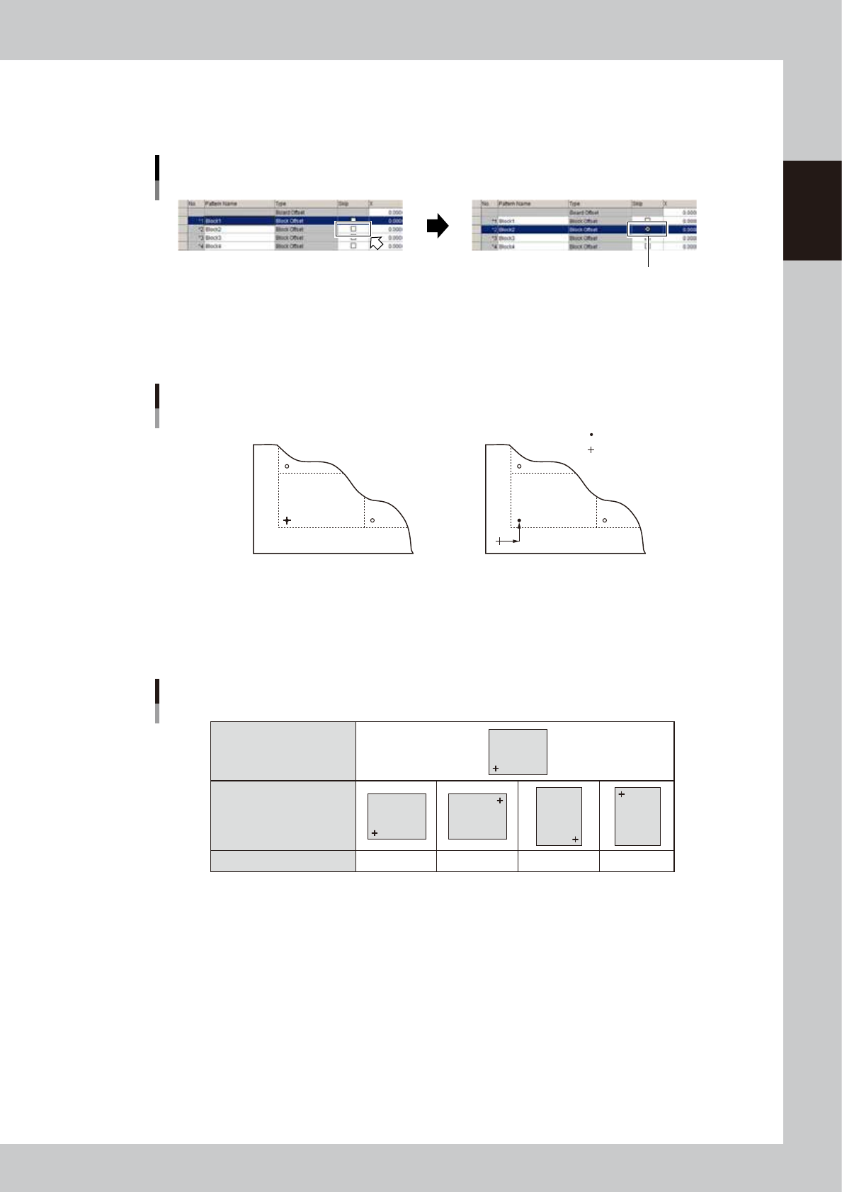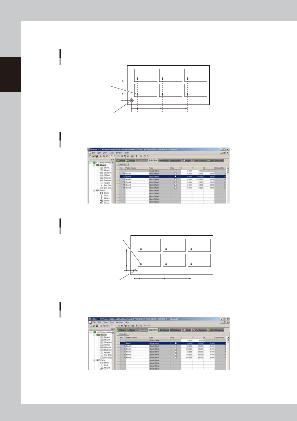 7-16 7 Editing the board data 3 Set the offset data on other blocks. On the second or subsequent rows set the offset data on other blocks. 0 -5 0 -5 40 50 100 When board origin is at the same position as reference block …