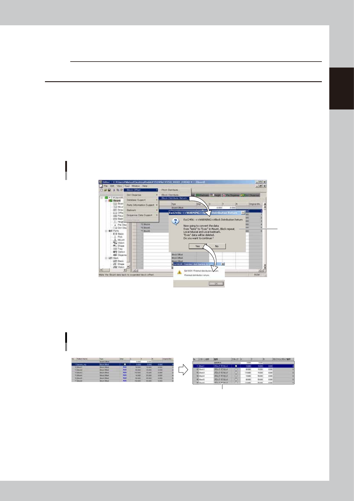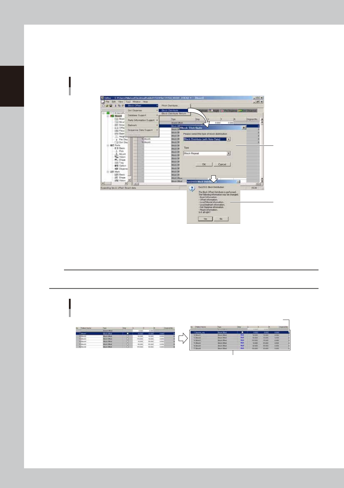 7-18 7 Editing the board data 3 Perform block offset distribution. When the "Block Distribution" dialog appears, check the contents and click the [Y es] button. 4 Check the message and click the [OK] button. A …