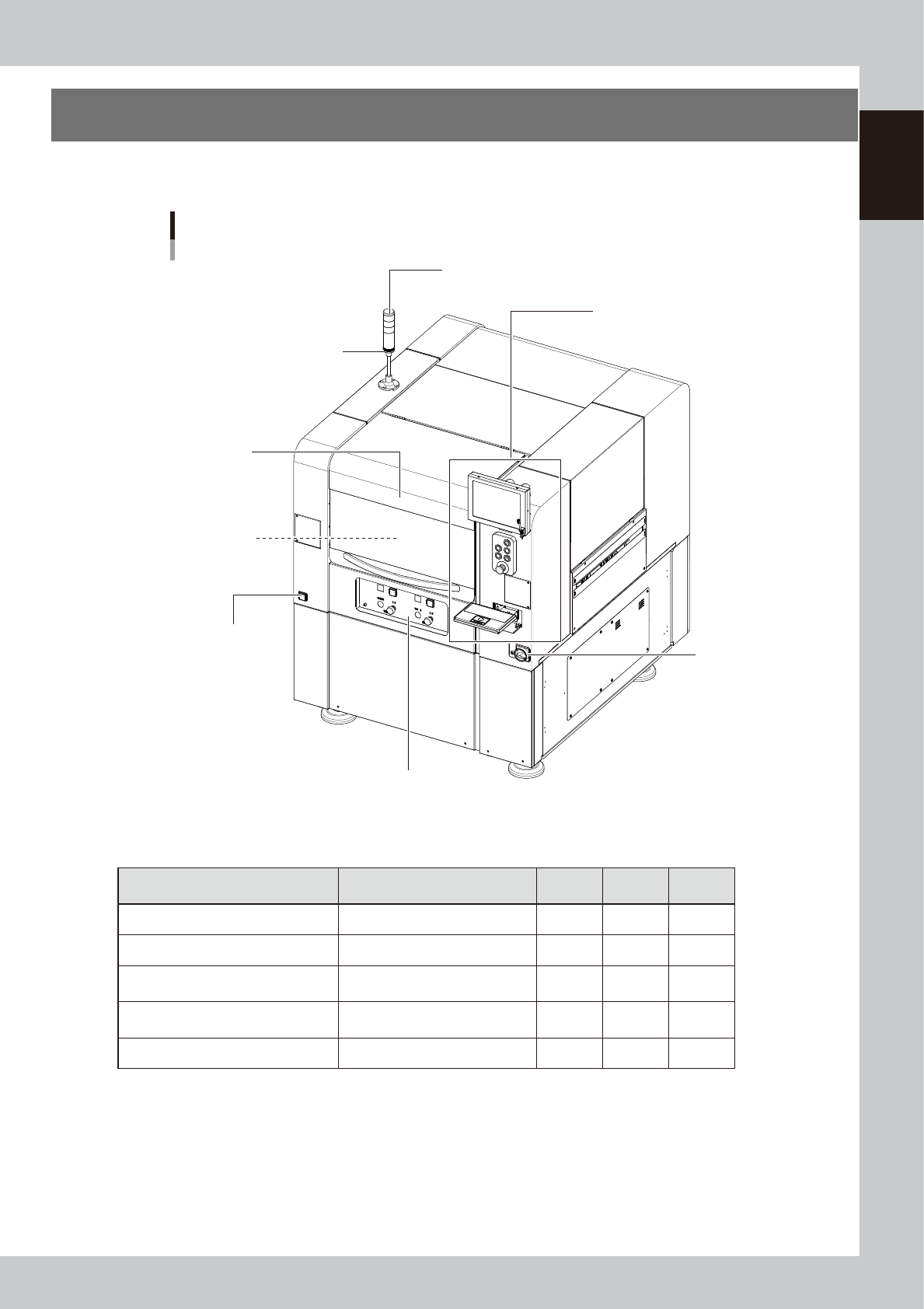 1-1 1 Part names and functions 1. Machine main unit A machine has the following configurations after installation is complete. Names and functions of major parts of the main unit are illustrated below . Main unit Main po…