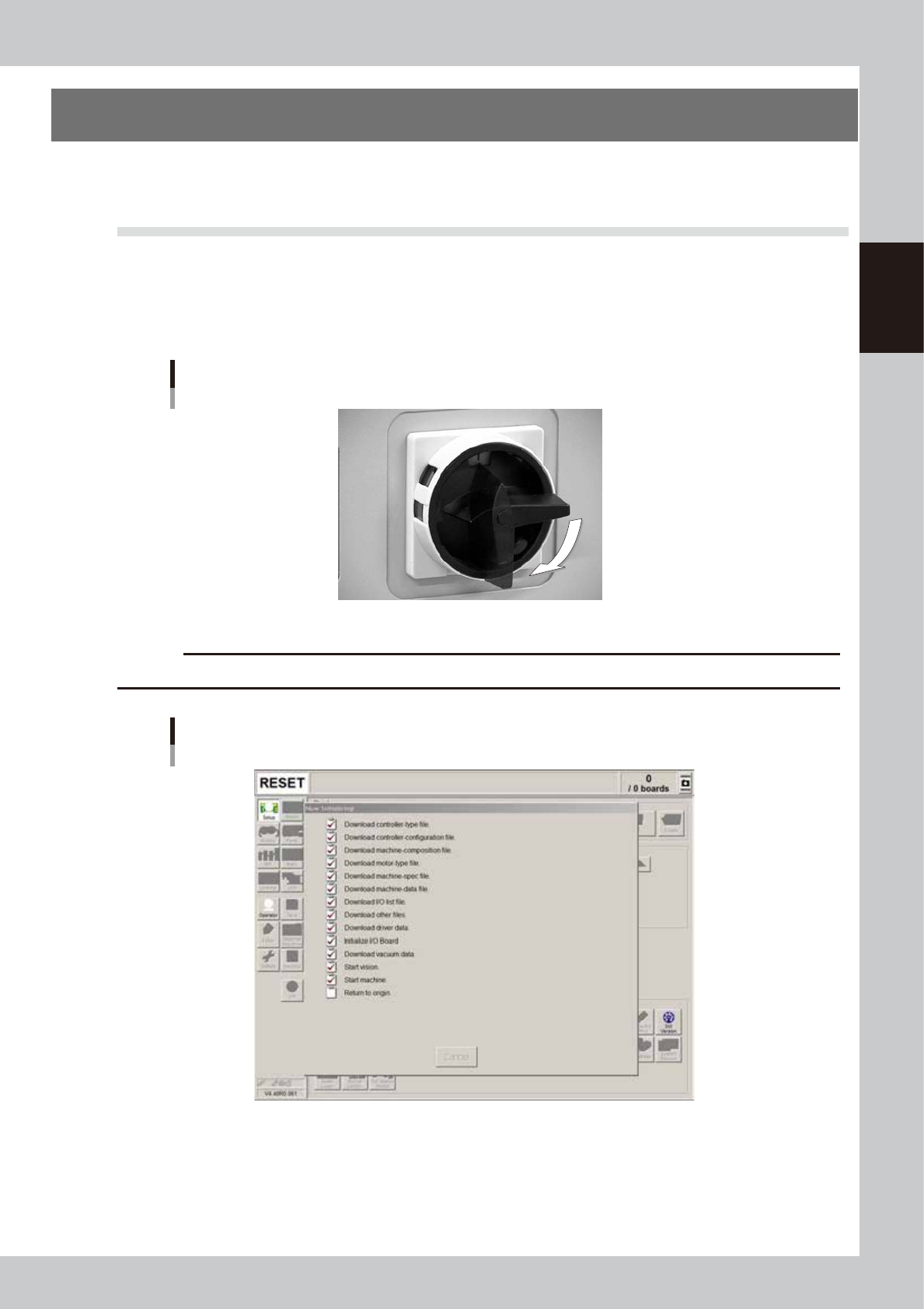 Initialization screen appears and the loading of the program necessary for machine operation starts.