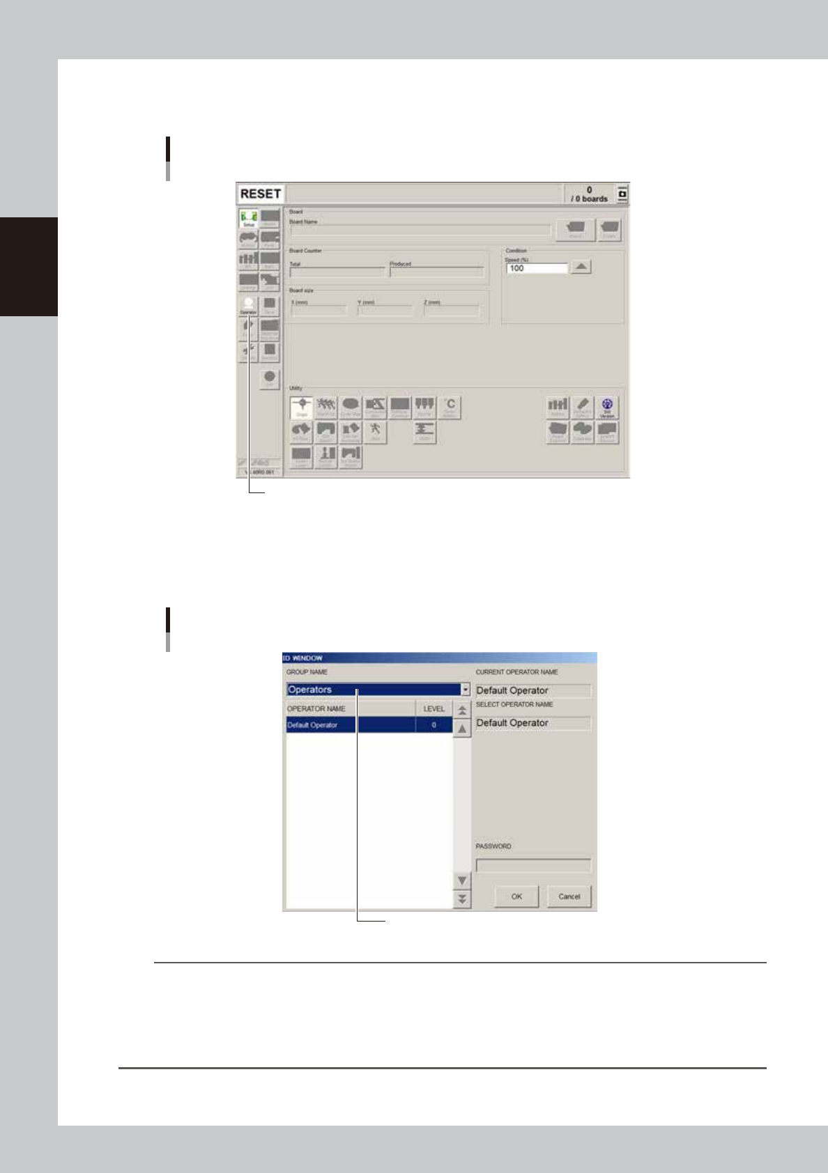 the factory setup, the program starts up at an operation level called “Default Operator”. This “Default Operator” level