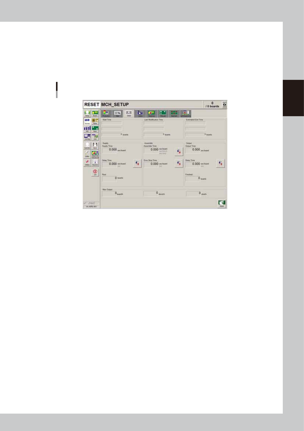 Shows the time that the machine has waited for board loading. The average delay time per board (sec per board) or the