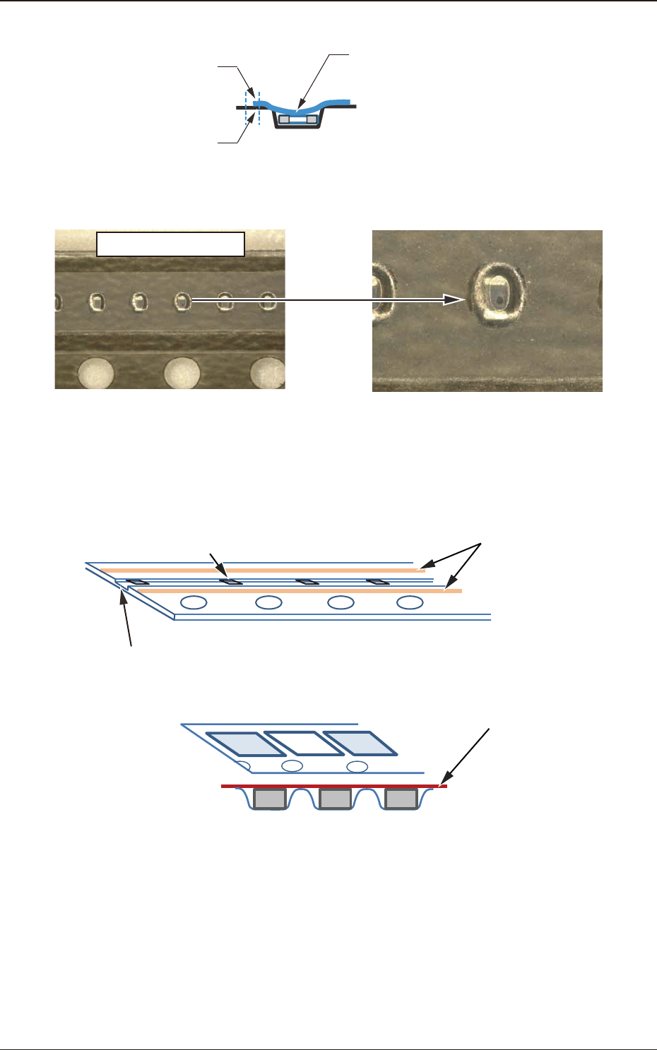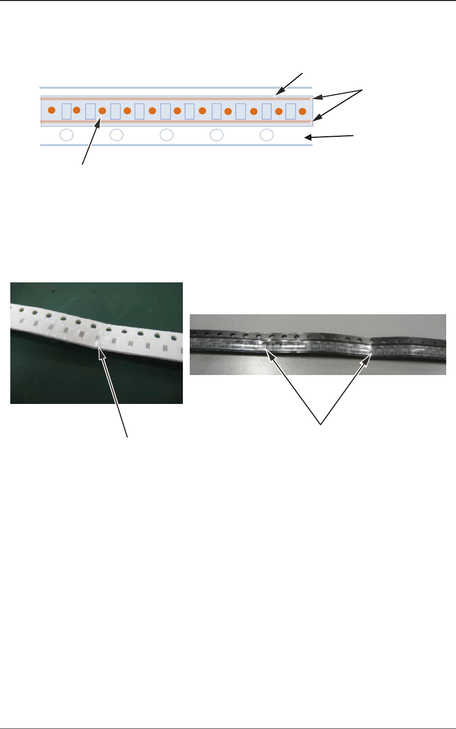 • 要求料带与料带膜在两个相邻料带孔之间的位置不存在融合的元件。 ※ 下记料带属于不可对应料带。 料带膜 料带膜粘结部 料带 料带与料带膜在两个相邻料带孔之间的位置存在融合部位 (不定周期的融合也是不可对应的。 ) Fig.A20 • 料带没有折痕。 ※ 如下图存在折痕的元件有不能对应的可能性。 折痕 折痕 Fig.A21 OM-1834 1-1 1