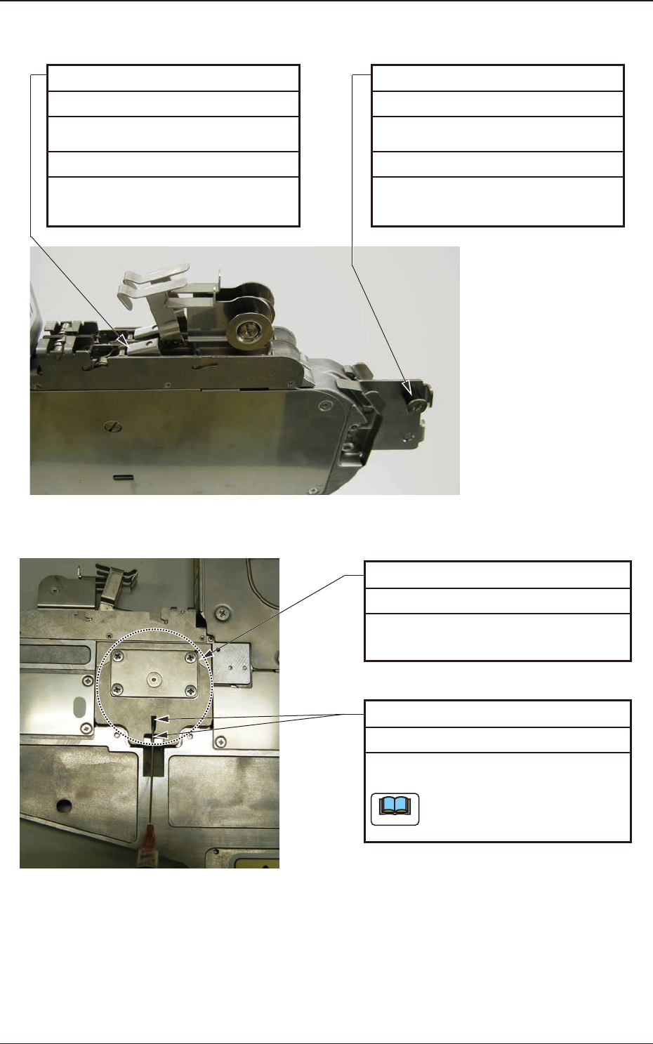 5.4.3 装载部 先前料带传送槽 装载抑制器 每周 清扫 请用气枪去除垃圾和灰尘。 请用浸过醇类的棉纱或棉棒除去轴承 和滚轴的附着物。 每三个月 清扫 每周 清扫 请用气枪去除垃圾和灰尘。 请用浸过醇类的棉纱或棉棒除去滚轴 的附着物。 每三个月 清扫 Fig.E5 链轮齿(3) (齿先) 每三个月 清扫 请用浸过醇类的棉纱或棉棒除去齿先的 附着物。 链轮齿(3) (注油口) 每三个月 注油 请使用注油治具,在注油口填充 MOLYNOC…