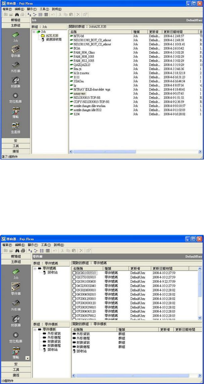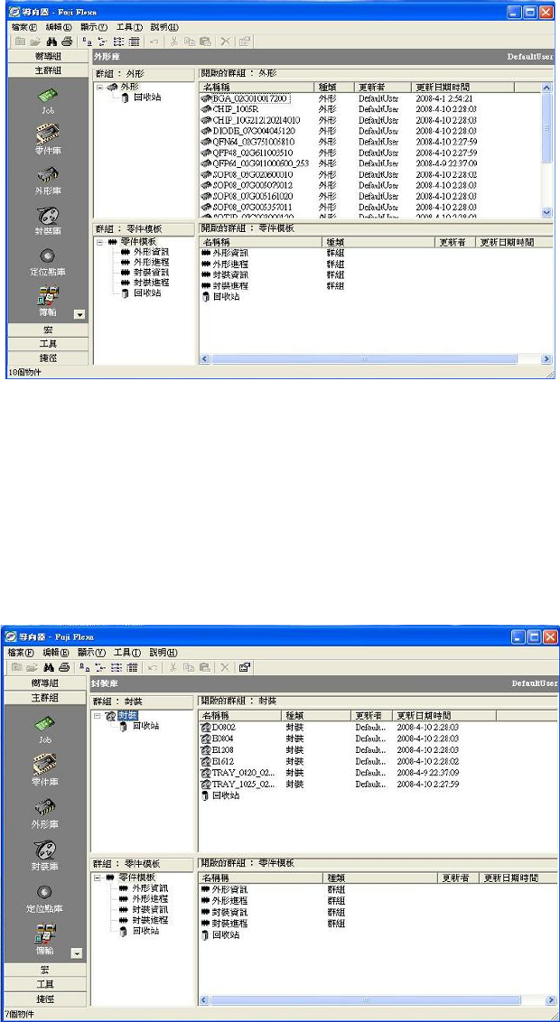 1-3-2,零件库 该 视图 模 式显 示 保存 在 零 件资 料 目录 内 的零 件 以及 可 利用 的 零件 模 板。 在该视图模式处于启动态时可 编辑、 移动、 增加、 删除零件资 料 和模板。在相关 的模式被使用的场 合,双击可 以打开其 零件资料。