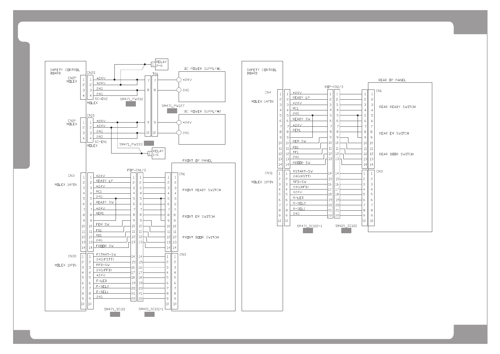 Page SAMSUNG TECHWIN 173 SM471 S afety Control Board Interface (1/4) NO. Lev . P ART NO. P ART NAME Q'TY Old No. Supply Supply L T Reference 1 AM03-0055 06A CABLE ASSY -GENERAL_PW_RELA Y 1 SM471-PW032 2 AM03-0055 04…