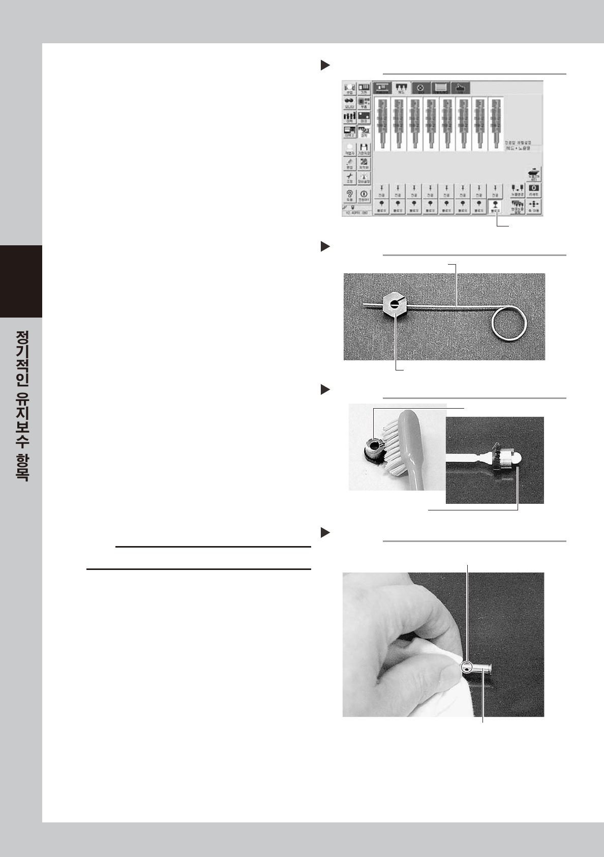 3-14 3 4 스플라 인 샤프 트 안 을 에어 블 로우 합니다 . [ 장치 ] - 「헤드 」화 면 에서 각 헤 드의 [ 블로 우 ] 버 튼을 누 르고 , 스플라인 샤프트 내 부를 에어 블 로 우 해 주십시 오 . 58 30 3 - L1- 0 0 5 알코 올 용기 에서 부품 을 꺼내어 , 청소합니 다. 1 . 노즐 블록은 , 클리 닝 와 이어 등으로 홀 안쪽을 깨끗 이 합 니다 . 57 32…