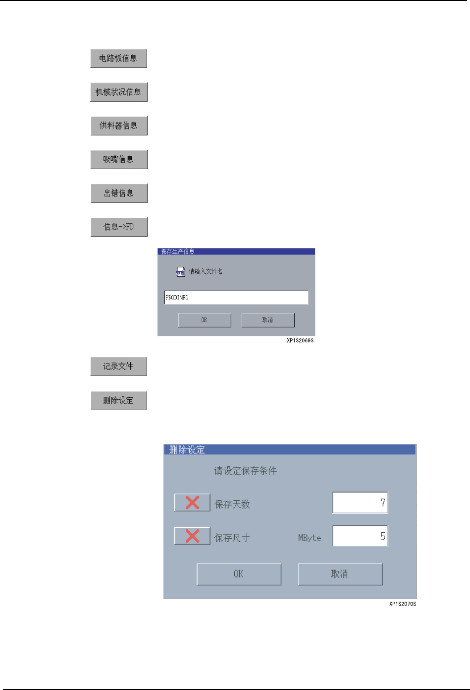 3. 操作系统 SYS-XP143-1.0S 108 XP-142E/143E 系统手册 生产信息显示条件的设定画面 数据说明 本画面可以进行展开生产信息的 时间范围的设定和选择程序。使时 间范围有效的话单击 [ × ] 键,请将按键的显示变为○ 。如果不设定时间范围时,请重新 选择此键使按键的显示 变为×。 选择程序时,从保存在当前 /sd0/FUJI/USER /PRODUCT/( 文件夹 ) 中的记录文件中读取生产 程序的名称,显…