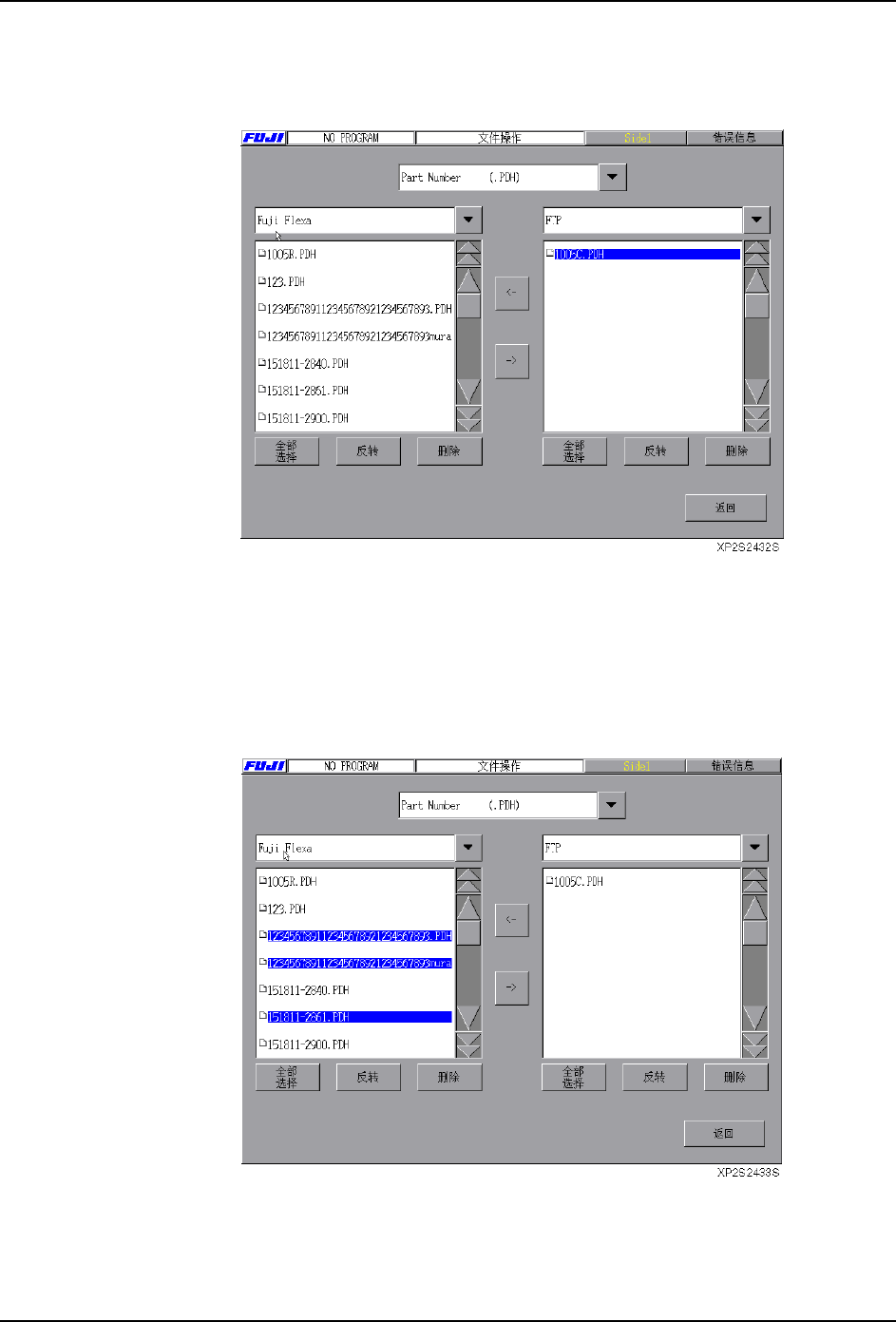 3. 操作系统 SYS-XP143-1.0S 138 XP-142E/143E 系统手册 〈复制机器 ( 远程文件处 ) 中的文件至 FujiFlexa 时〉 5. 从右侧的文件一览表中选择要复制的文件 ( 可以选择几个 )。 6 . 按 下[←]键 后 , 可 以 复 制 文 件 至F u j iFle xa 的 元件数据库内。确 认完成复制后取 出软 盘 , 请 按 下[关 闭]键 。 〈复制 FujiFlexa 的数据至机器 ( …