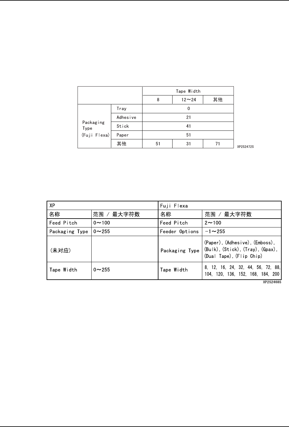 3. 操作系统 SYS-XP143-1.0S 146 XP-142E/143E 系统手册 Package 数据 在 XP 机器上处 理的 「 Packaging Type」 ,在 Fuji Flexa 上称作为 「Feeder Option」 。与 Fuji Flexa 上用包装编辑显 示的 「Packaging Typ e」不同。 ·Packaging Type:XP 和 Fuji F lexa 的有 效范围不同。 在 Fu ji F…