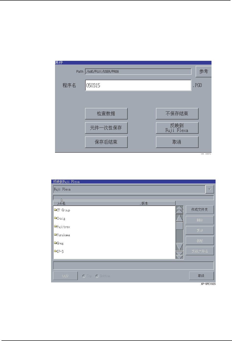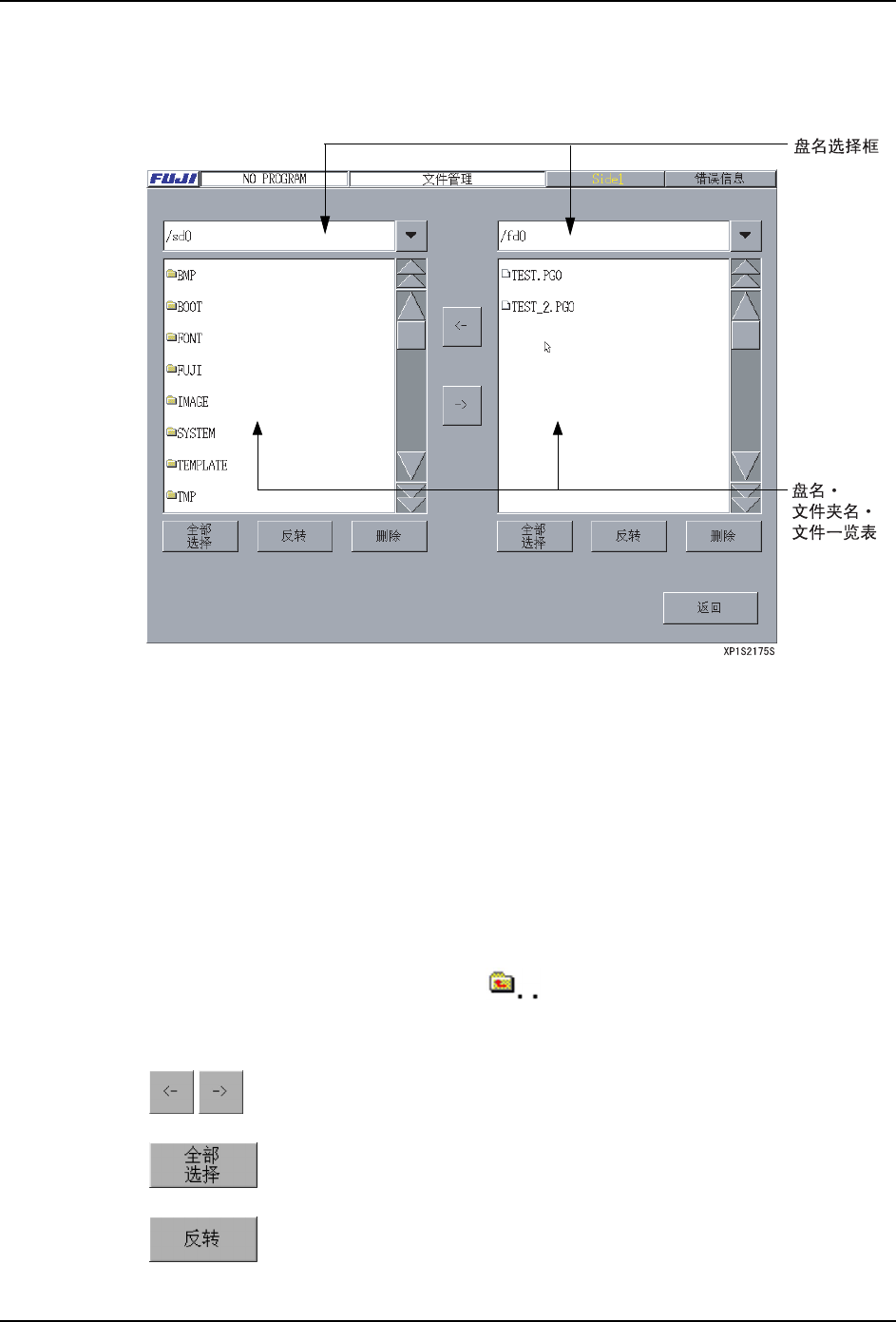 3. 操作系统 SYS-XP143-1.0S 158 XP-142E/143E 系统手册 3.7.6 文件管理 单击 [ 维修保养 B] 画面的 [ 文件管理 ] 按键后,显示出 [ 文件管理 ] 画面。 驱动器选择组合框 选择要操作的驱动器。 驱动器·文件夹·文件一览表 双击文件夹名的项目后移动到低 位的文件夹。双击下图的项目后移 动到高位的文件夹。单 击文件名的项目后变成选择状态 。( 可以选择几个 ) 操作按键说明 /fd0: 软…