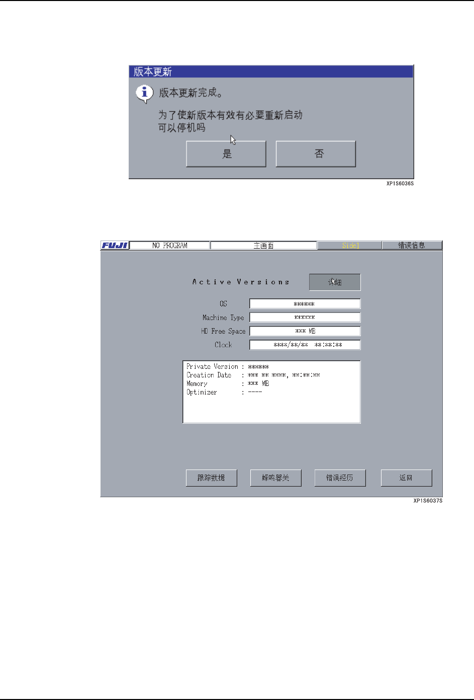 SYS-XP143-1.0S 3. 操作系统 XP-142E/143E 系统手册 161 3.8.2 应用软件的版本更新 应用软件 ( 机器控制软件 ) 的版本更新方法如下所示。 操作步骤 1. 在 [ 主画面 ] 上选择 [ 维修保养 B]、[ 版本更新 ],显示出以下画面。 2. 把写有 “APL1” 的软盘插入软驱中,按下 [ 执行 ] 键。如果不插入软盘按下 [ 执行 ] 键 后显示出以下的画面。插入软盘按 下 [OK] 键后,…