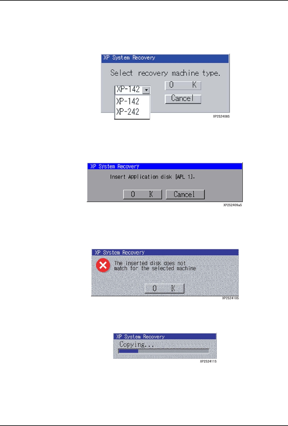3. 操作系统 SYS-XP143-1.0S 166 XP-142E/143E 系统手册 复制应用盘 操作步骤 1. 在格式化处理结束后显示出选择机器型号的对话 框。 2. 单击 [OK] 键后,显示安装应用盘 APL1 的对话框。单击 [ 取消 ] 键后,停止复位处理, 将X P机 器 关 机 。 3. 单击 [OK] 键后,当没有插入正确的软盘 ( 应用盘 APL1) 时,显示出错信息。另外,当 安装了机型选择对话框中所选择 的机型…
