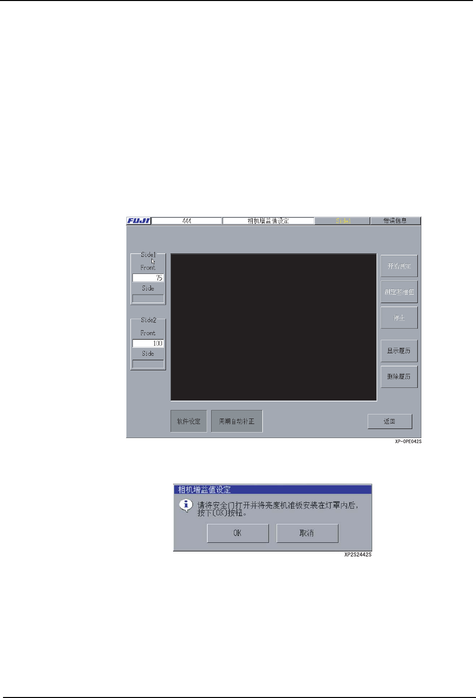 5. 将亮度板安装在机器前侧 (Side1)的灯罩上,按下 [ 相机增益值设定 ] 对话框的 [OK]