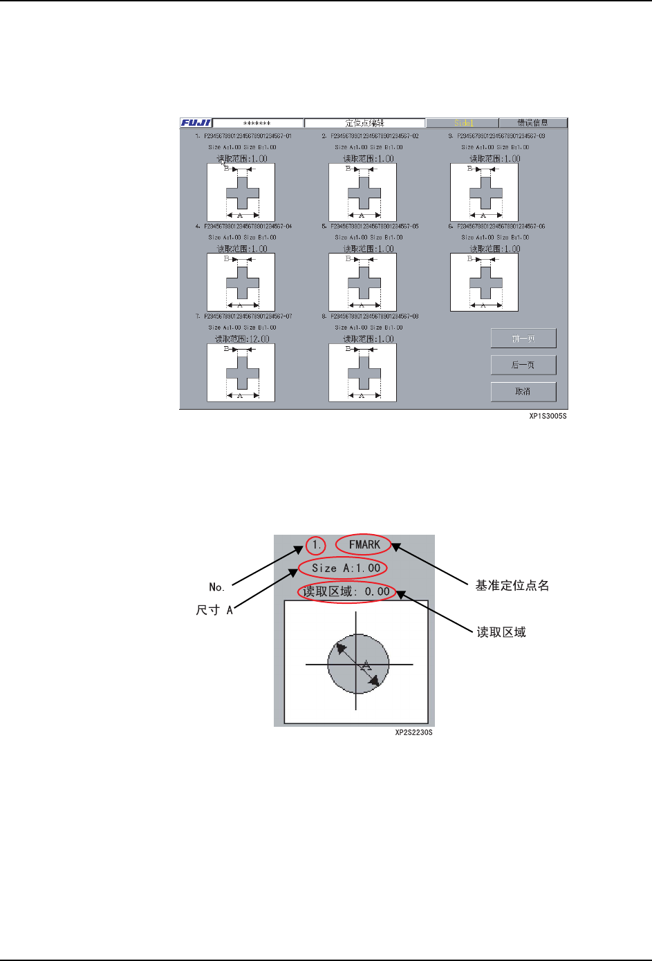 显示基准定位点编号和 「定位点名」、「尺寸 A」、「尺寸 B」的尺寸,显示 [ 读取区域 ]。