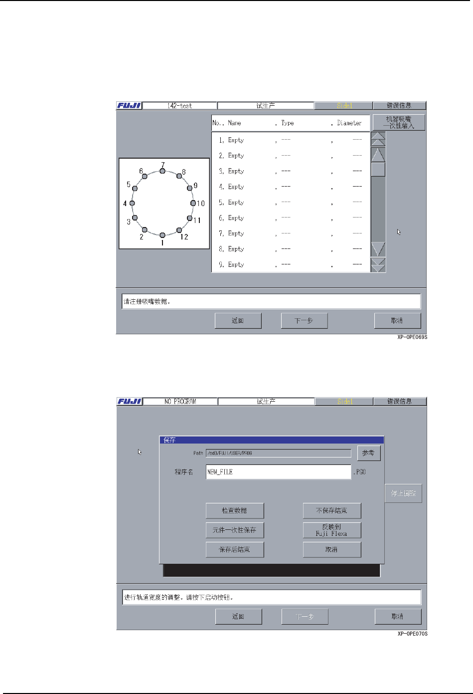SYS-XP143-1.0S 4. 机器生产程序 XP-142E/143E 系统手册 255 5. 在 [ 跳过 ] 左横侧输入顺序 No., 按下 [ 跳过 ] 按键后,显示出贴装的元件。按下 [ 布 线结构 ] 后显示出元件尺寸和供应 方向。 步骤 7 注册吸嘴 注册吸嘴数据。 步骤 8 确认保存 进行保存的确认。