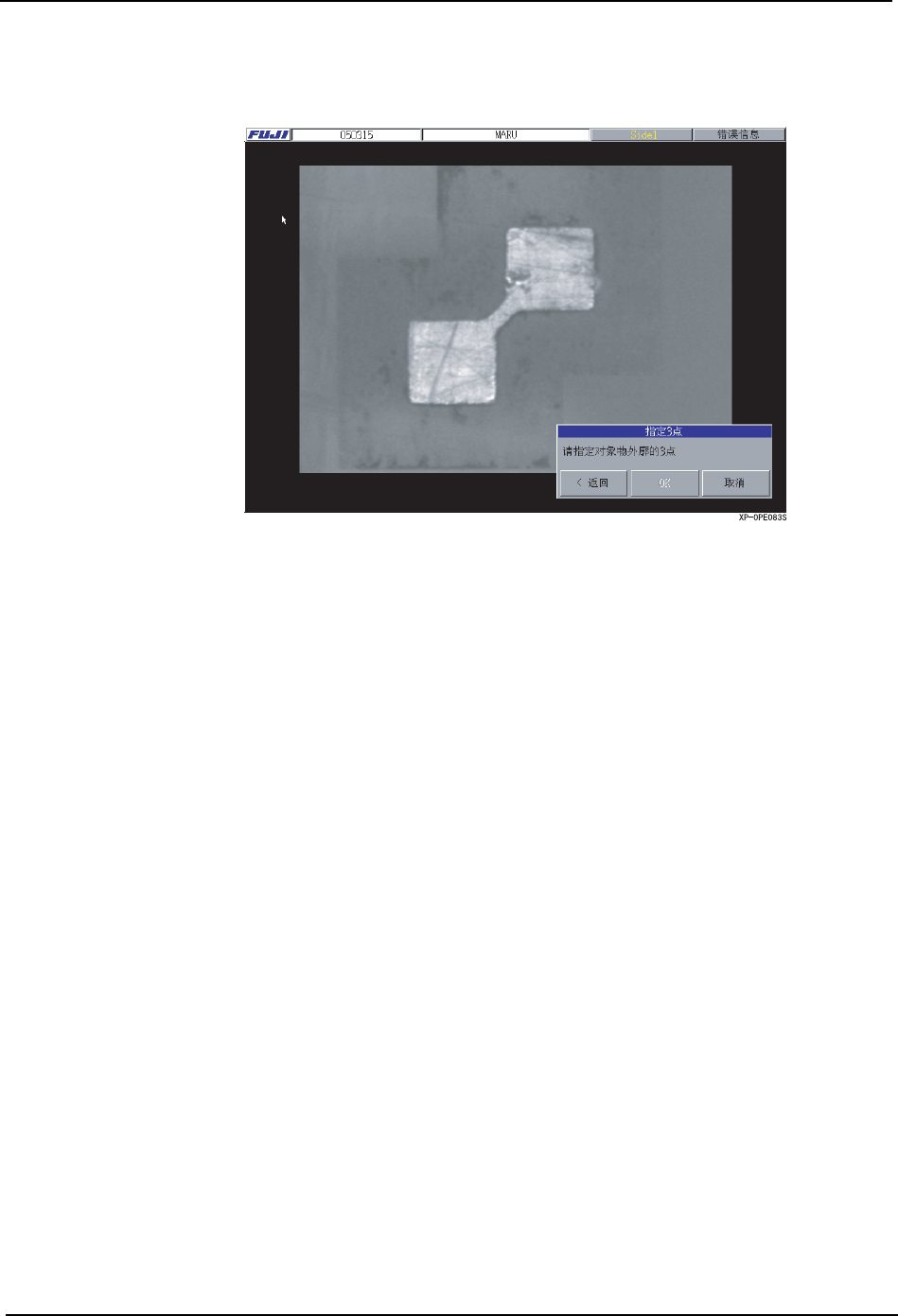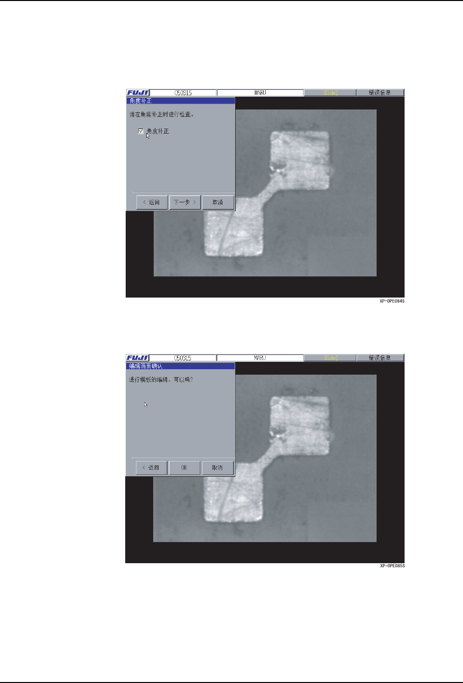 5.MDW/PDW SYS-XP143-1.0S 274 XP-142E/143E 系统手册 12.在 「角度补正」对话框上选择是否 执行角度补正。要进行角度补正时使 其处于选定状 态。如以下的说明影像一样,当 形状是正圆形时不能识别角度或者由 于不均匀等而不想 进行角度补正时请取消选定。在 默认值上设定为执行角度补正。选择 后,按下 [ 下一步 ]按 键 。 13.按下在 「编辑画面确认」对话框内 的 [OK] 按键,移动到模板编辑器…