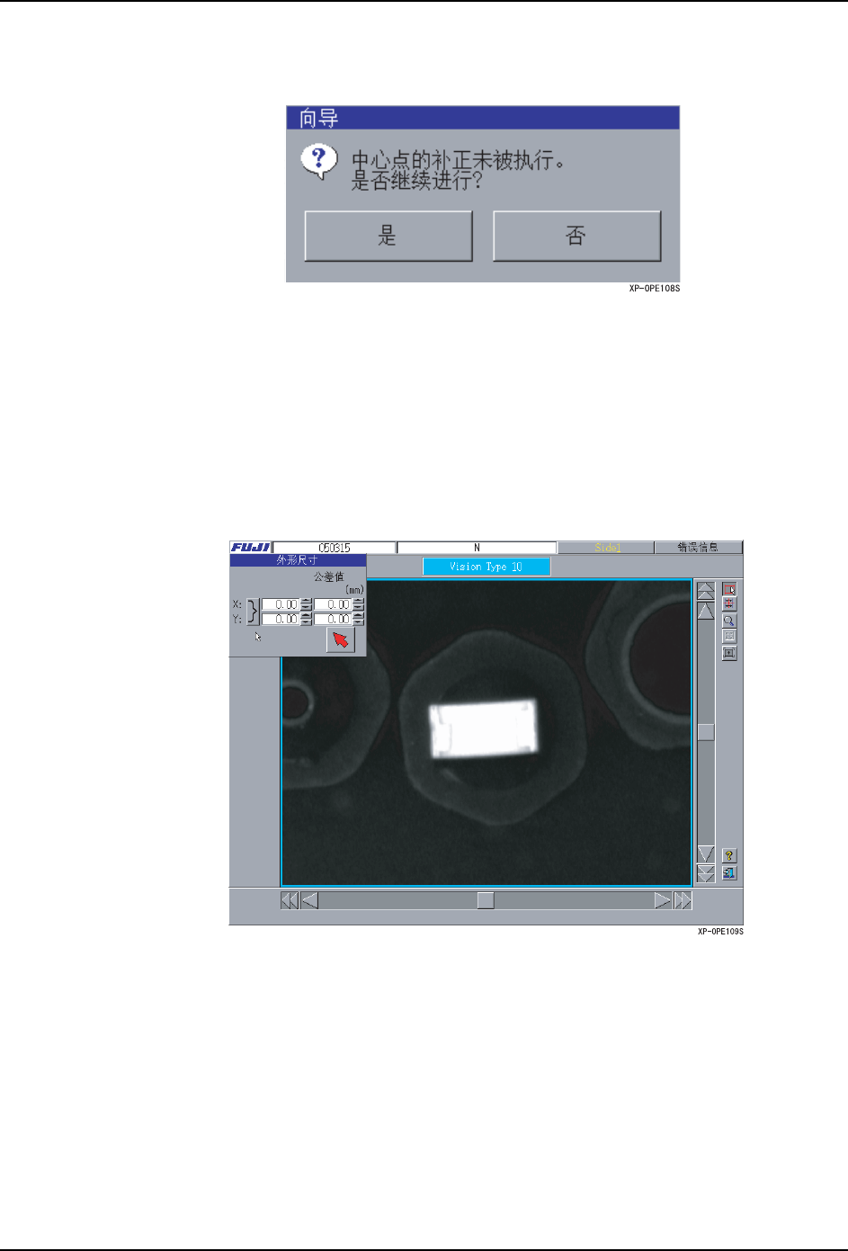 5.MDW/PDW SYS-XP143-1.0S 292 XP-142E/143E 系统手册 在卡尺角度、中心 X、中心 Y 的值不为 0 的状态下按下 [下一步]按键后,显示出以下的 信息。 14.显示出 [外形尺寸]对话框。 在初期状态下, 用 Pa rtTypeData 设定的 Body Length(X) 的值在 「外形尺寸 :X」中, Body Length(Y) 的值在 「外形尺寸: Y」中显示出,在画面上显示出外形尺寸的矩…